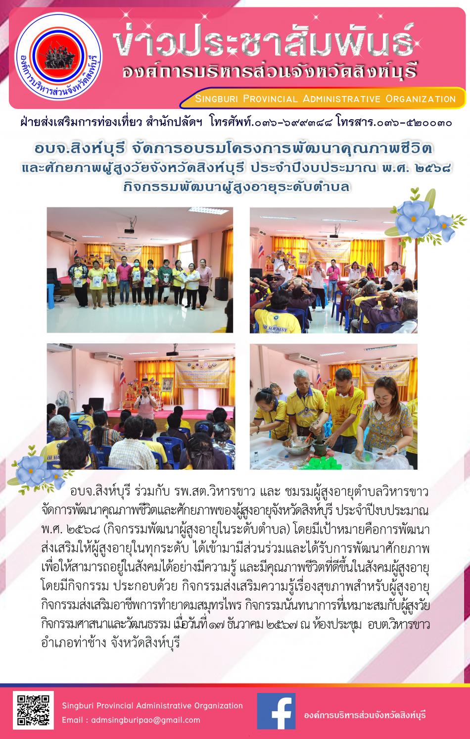 อบจ.สิงห์บุรี จัดโครงการพัฒนาคุณภาพชีวิตและศักยภาพผุ้สูงอายุจังหวัดสิงห์บุรี ประจำปีงบประมาณพ.ศ.2568 กิจกรรมพัฒนาผู้สูงอายุในระดับตำบล [17 ธันวาคม 2567]