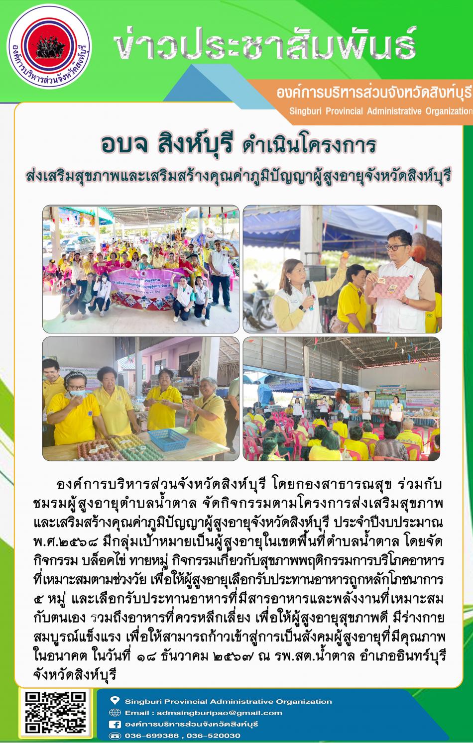 อบจ.สิงห์บุรี ร่วมกับ สสส. จัดโครงการสร้างเสริมสุขภาพผู้สูงอายุวัดสว่างณ์ทั้งพลังกาย พลังใจ และพลังปัญญาอย่างยั่งยืน [17 ธันวาคม 2567]