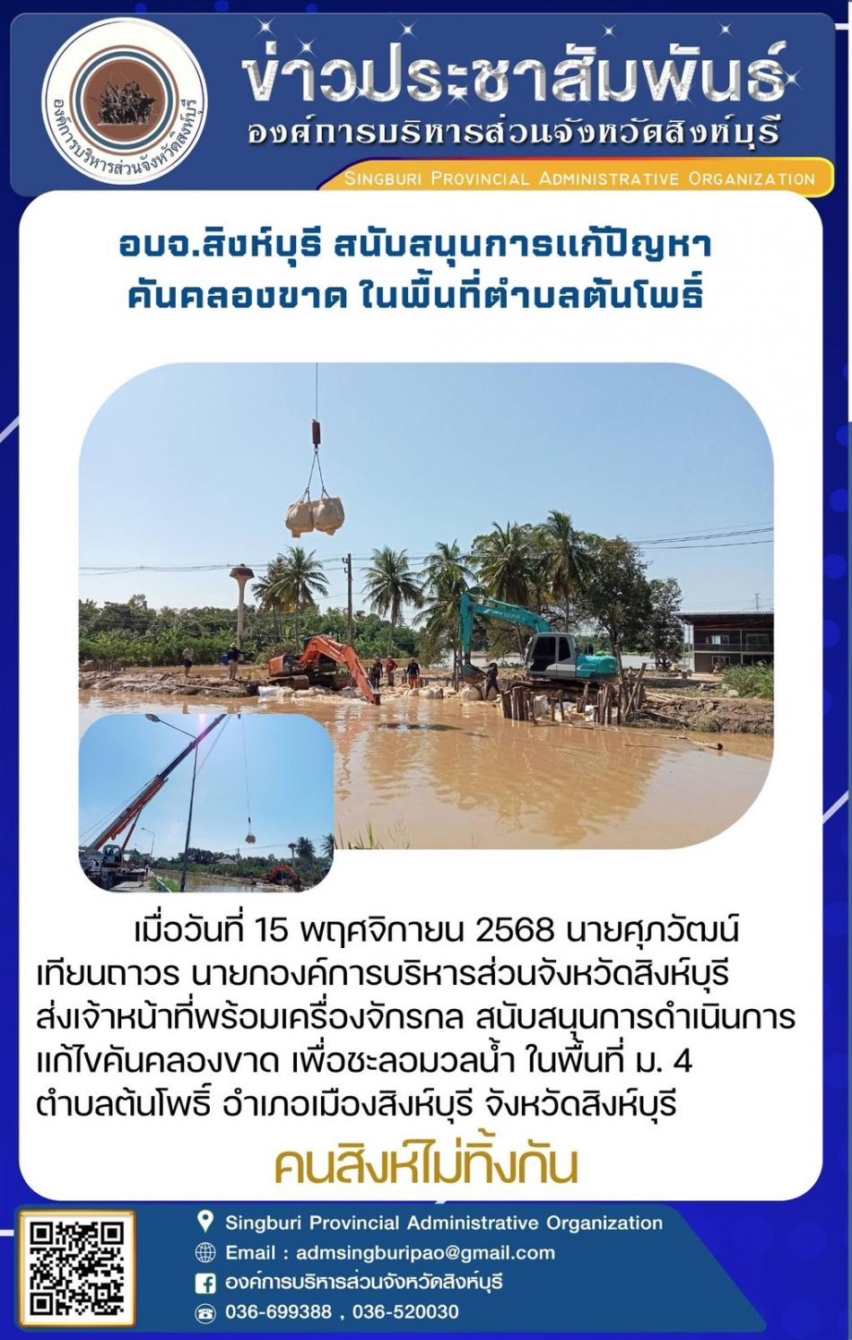 อบจ.สิงห์บุรี สนับสนุนการแก้ปัญหาคันคลองขาด ในพื้นที่ตำบลตันโพธิ์ [15 พฤศจิกายน 2568]
