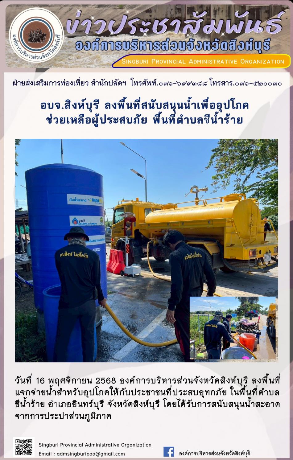 อบจ.สิงห์บุรี ลงพื้นที่สนับสนุนน้ำเพื่ออุปโภค ช่วยเหลือผู้ประสบอุทกภัย พื้นที่ตำบลชีน้ำร้าย [16 พฤศจิกายน 2568]
