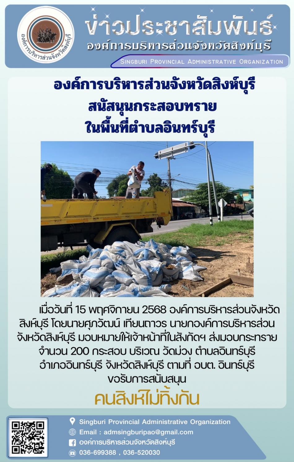 องค์การบริหารส่วนจังหวัดสิงห์บุรี สนับสนุนกระสอบทราย ในพื้นที่ตำบลอินทร์บุรี [15 พฤศจิกายน 2568]
