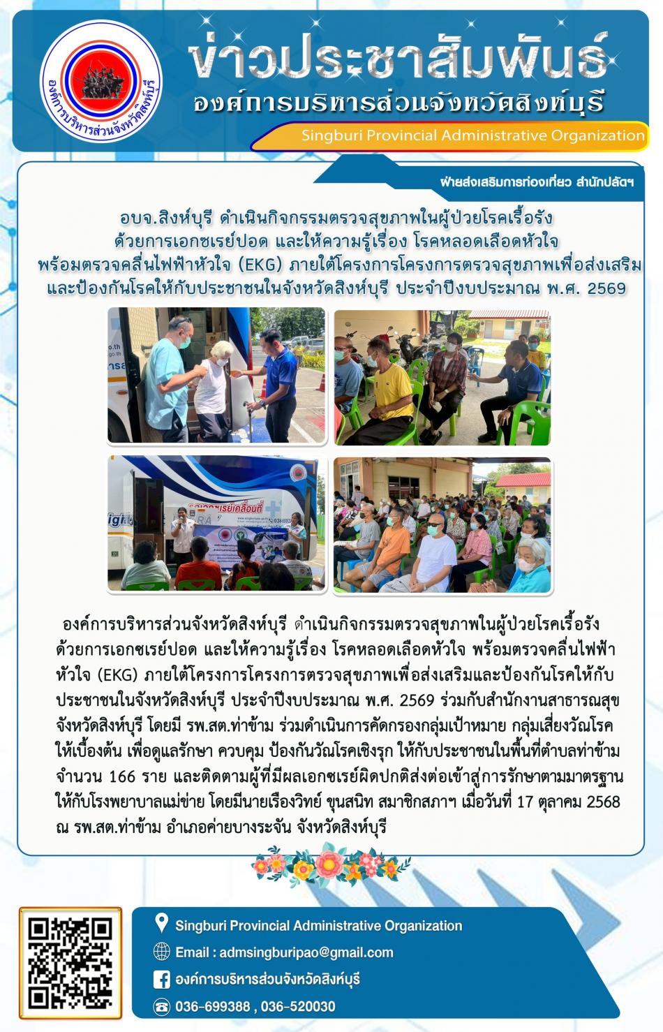 อบจ. สิงห์บุรี ดำเนินกิจกรรมตรวจสุขภาพ ในผู้ป่วยโรคเรื้อรังด้วยการเอ็กซเรย์ปอดและให้ความรู้เรื่องโรคหลอดเลือดหัวใจพร้อมตรวจคลื่นไฟฟ้าหัวใจ(EKG)... [17 ตุลาคม 2568]