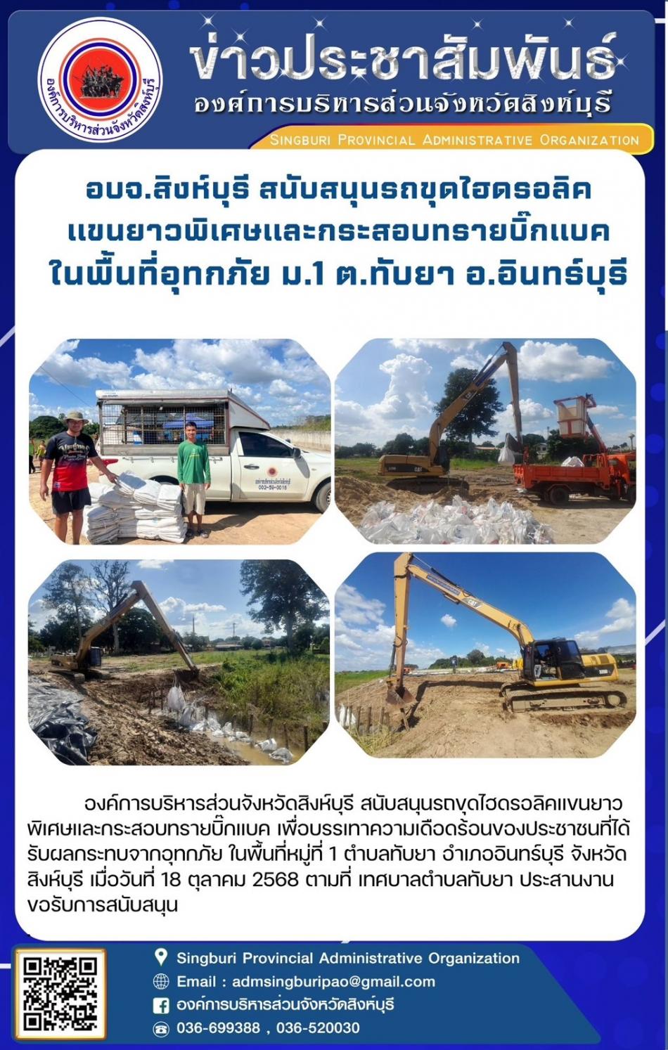 อบจ.สิงห์บุรี สนับสนุนรถขุดไฮดรอลิค แขนยาวพิเศษและกระสอบทรายบิ๊กแบ็ค ในพื้นที่อุทกภัย หมู่ 1 ตำบลในพื้นที่อุทกภัย หมู่ 1 ตำบลทับยา อำเภออินทร์บุรี [18 ตุลาคม 2568]