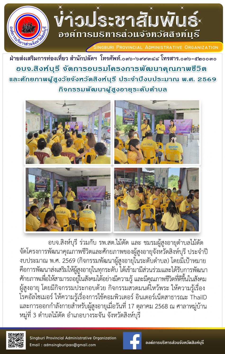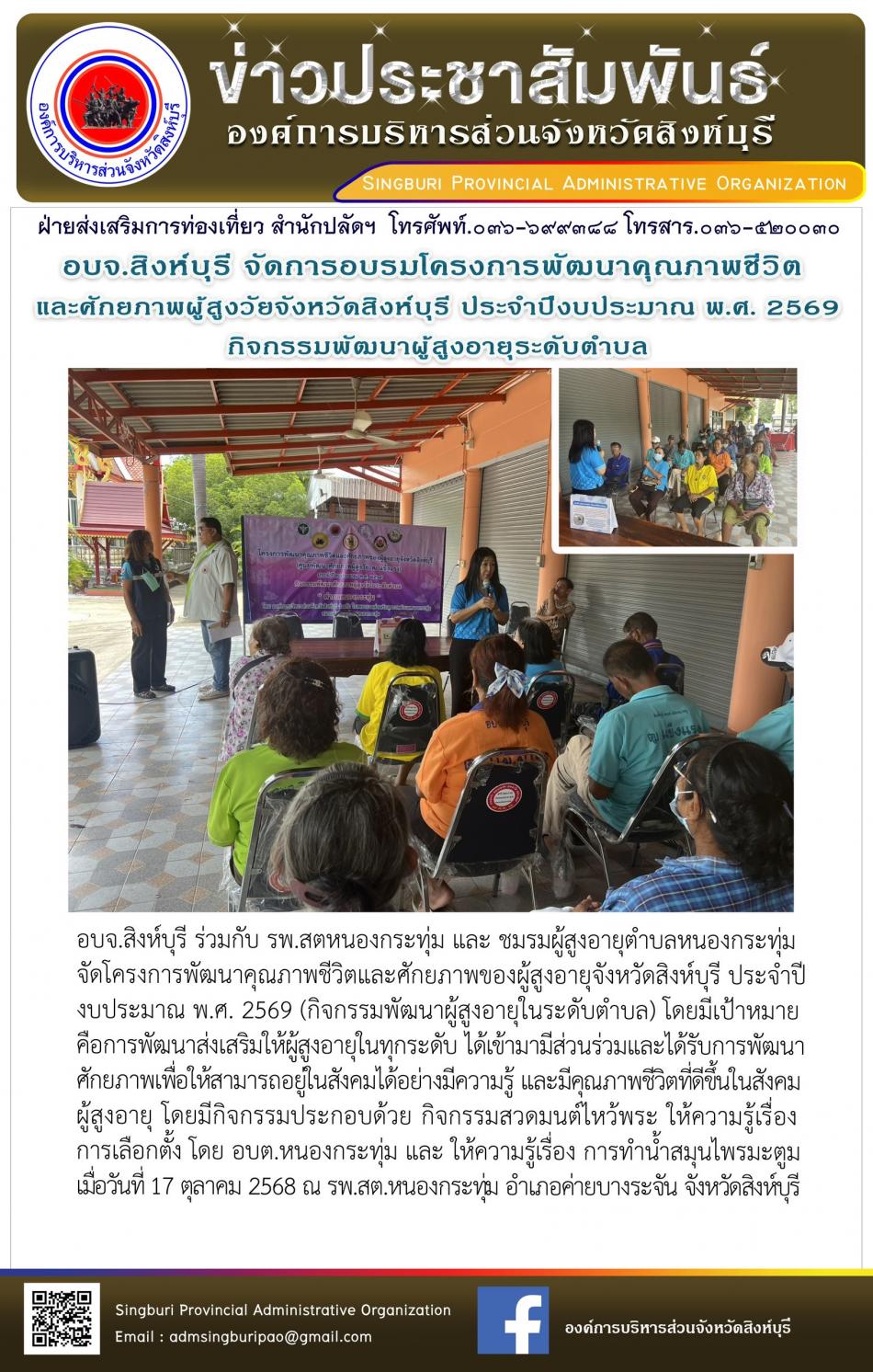 อบจ.สิงห์บุรี จัดโครงการพัฒนาคุณภาพชีวิตและศักยภาพของผู้สูงอายุ จังหวัดสิงห์บุรี ประจำปีงบประมาณ พ.ศ. 2569 กิจกรรมพัฒนาผู้สูงอายุระดับตำบล [17 ตุลาคม 2568]