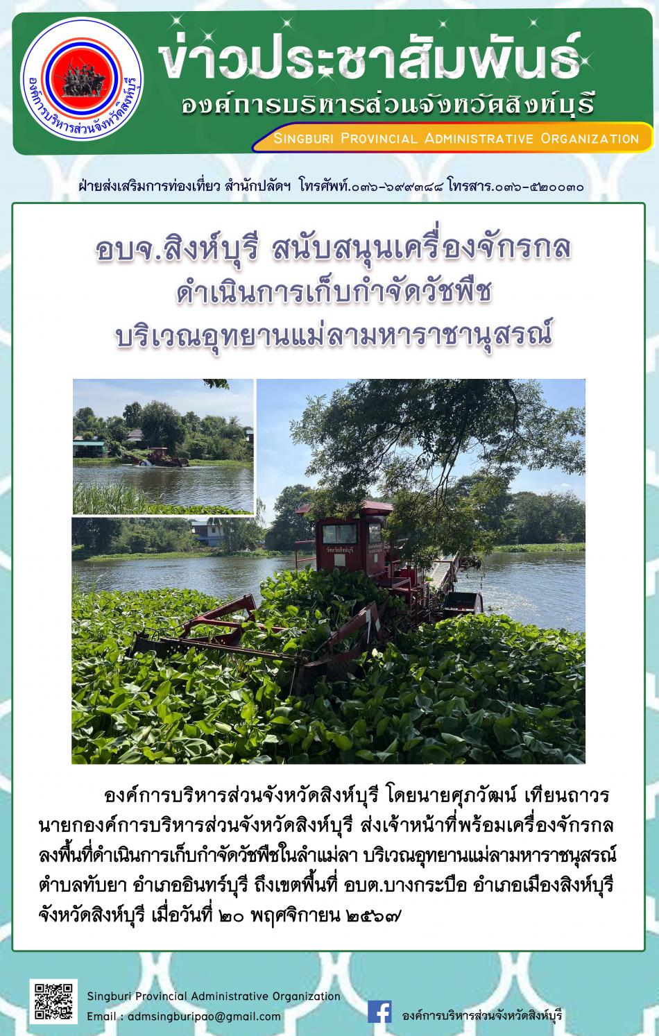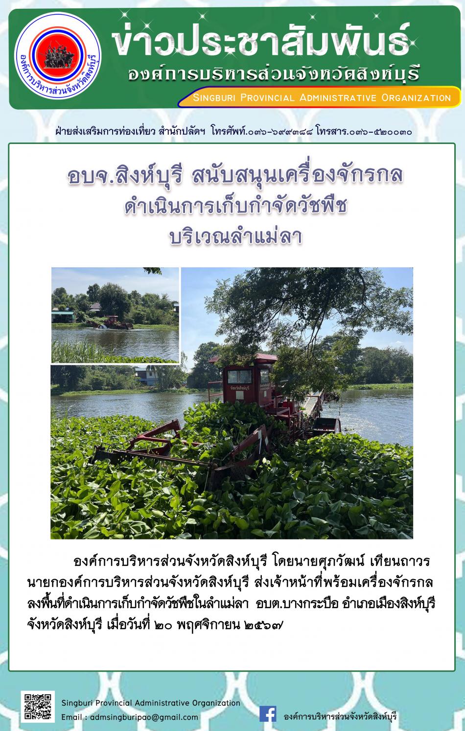 อบจ.สิงห์บุรี ส่งเจ้าหน้าที่พร้อมเครื่องจักรกล เก็บกำจัดวัชพืช บริเวณลำแม่ลา [20 พฤศจิกายน 2567]