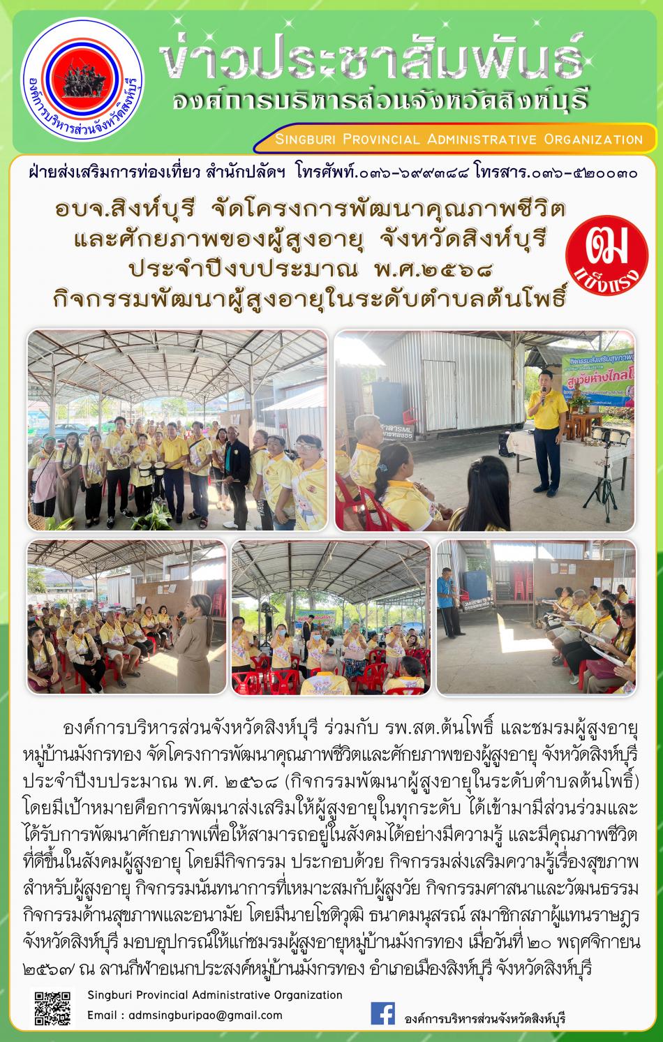 อบจ.สิงห์บุรี ดำเนินโครงการส่งเสริมสร้างคุณค่าภูมิปัญญาผู้สูงอายุจังหวัดสิงห์บุรี [20 พฤศจิกายน 2567]