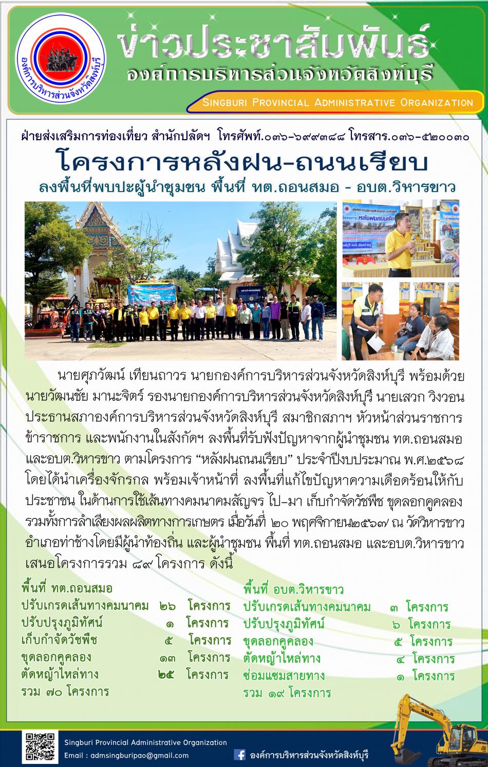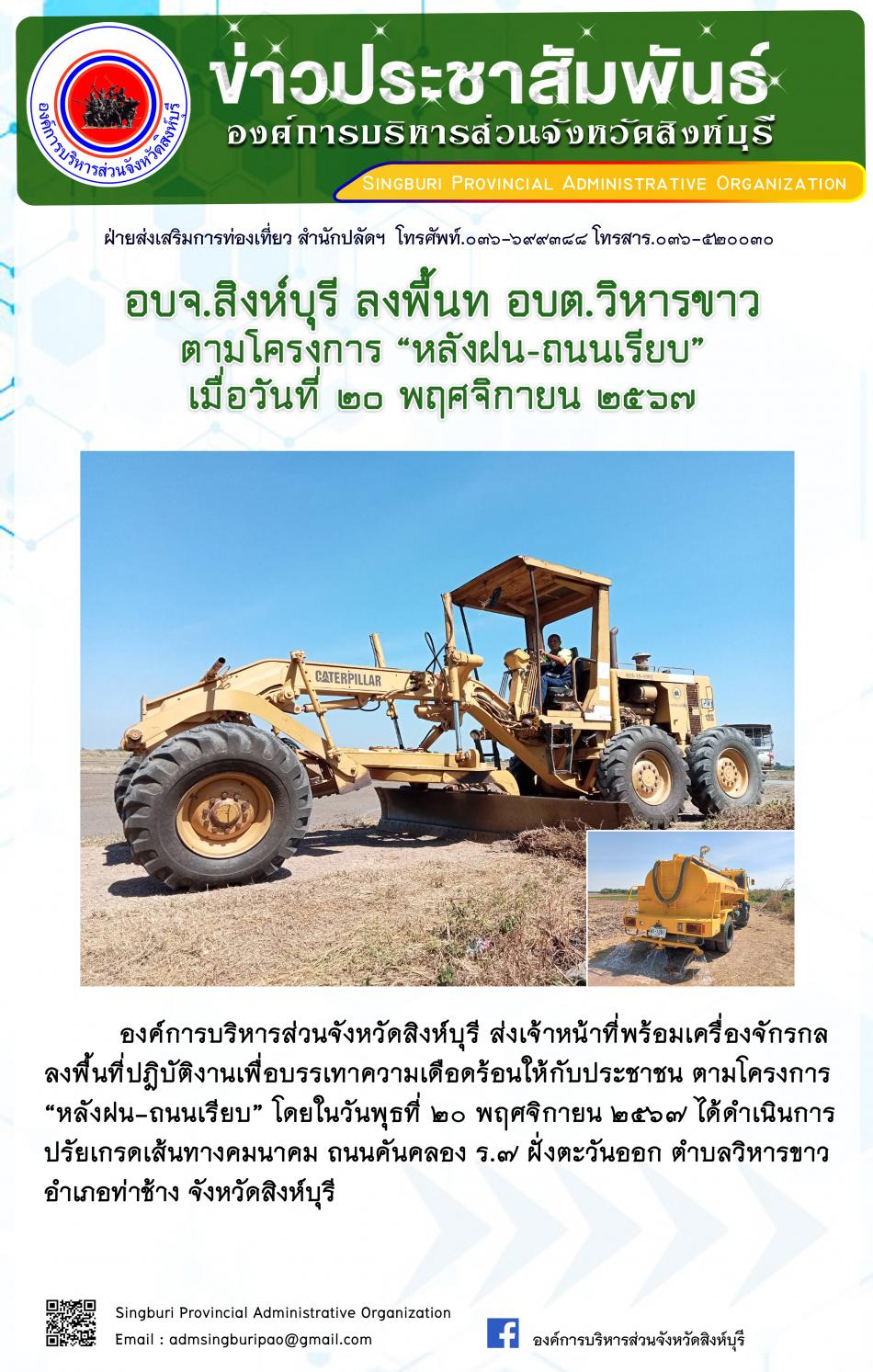 อบจ.สิงห์บุรี ลงพื้นที่ อบต.วิหารขาว ตามโครงการ "หลังฝน - ถนนเรียบ" [20 พฤศจิกายน 2567]