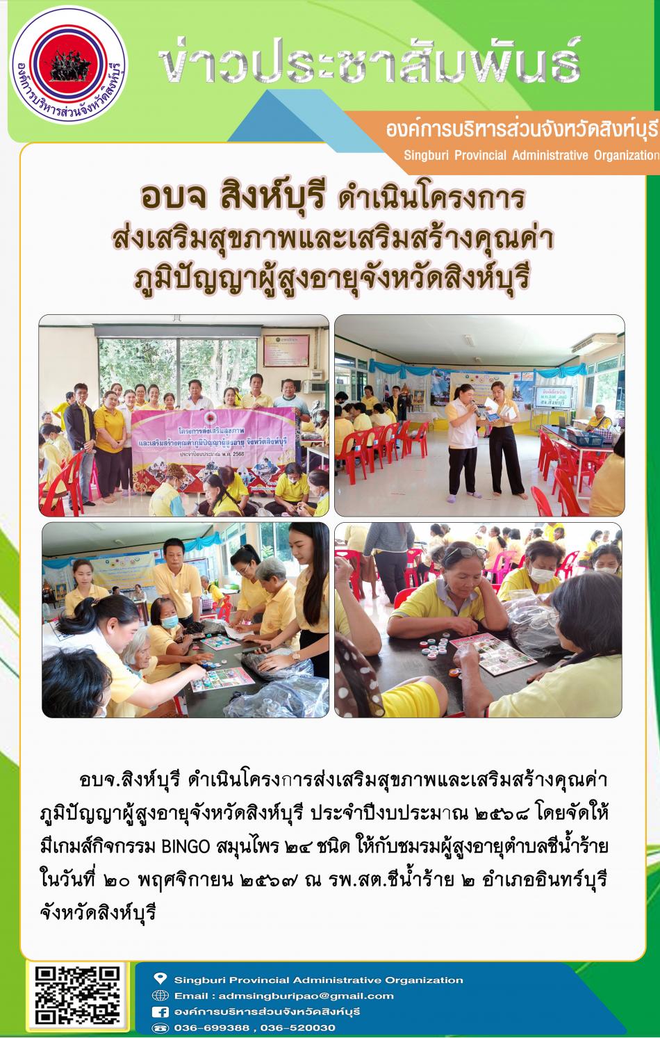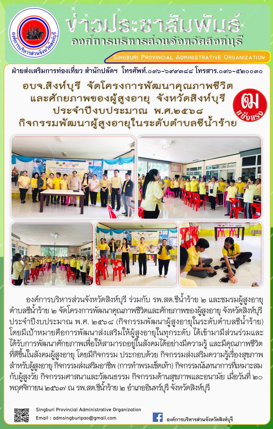 องค์การบริหารส่วนจังหวัดสิงห์บุรี จัดโครงการพัฒนาคุณภาพชีวิต และศักยภาพผู้สูงอายุ จังหวัดสิงห์บุรี (ศูนย์พัฒนาศักยภาพผู้สูงวัย ฒ แข็งแรง) ประจำปีงบประมาณ พ.ศ.2568 กิจกรรมพัฒนาผู้สูงอายุในระดับตำบลชีน้ำร้าย [20 พฤศจิกายน 2567]