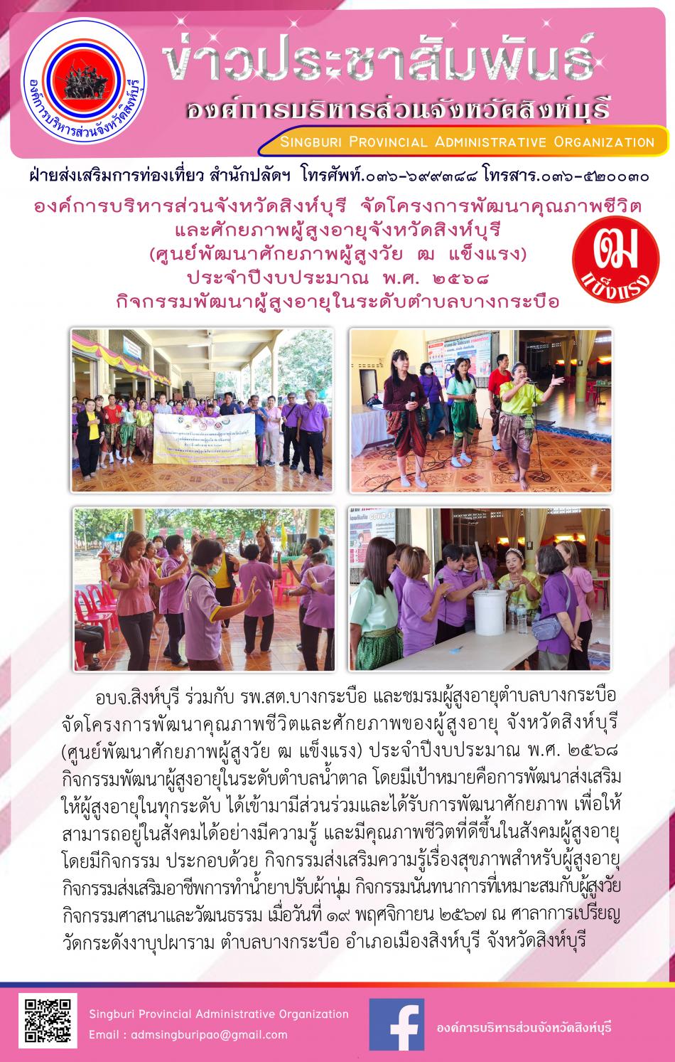 องค์การบริหารส่วนจังหวัดสิงห์บุรี จัดโครงการพัฒนาคุณภาพชีวิต และศักยภาพผู้สูงอายุ จังหวัดสิงห์บุรี (ศูนย์พัฒนาศักยภาพผู้สูงวัย ฒ แข็งแรง) ประจำปีงบประมาณ พ.ศ.2568 กิจกรรมพัฒนาผู้สูงอายุในระดับตำบลบางกระบือ [19 พฤศจิกายน 2567]