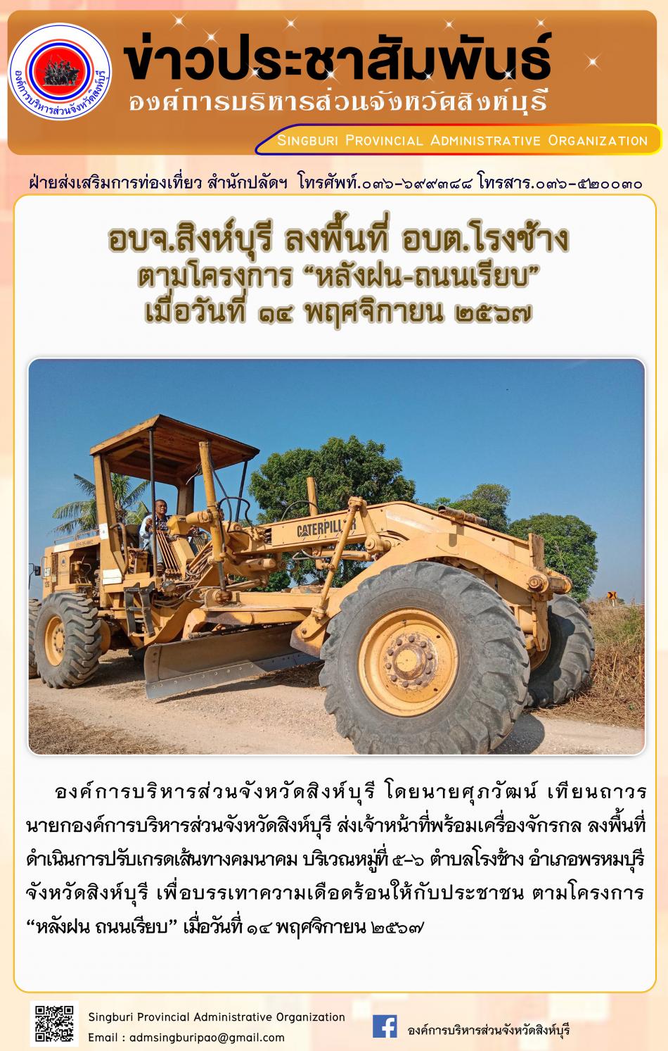 อบจ.สิงห์บุรี ลงพื้นที่ อบต.โรงช้าง ตามโครงการ "หลังฝน - ถนนเรียบ" [14 พฤศจิกายน 2567]