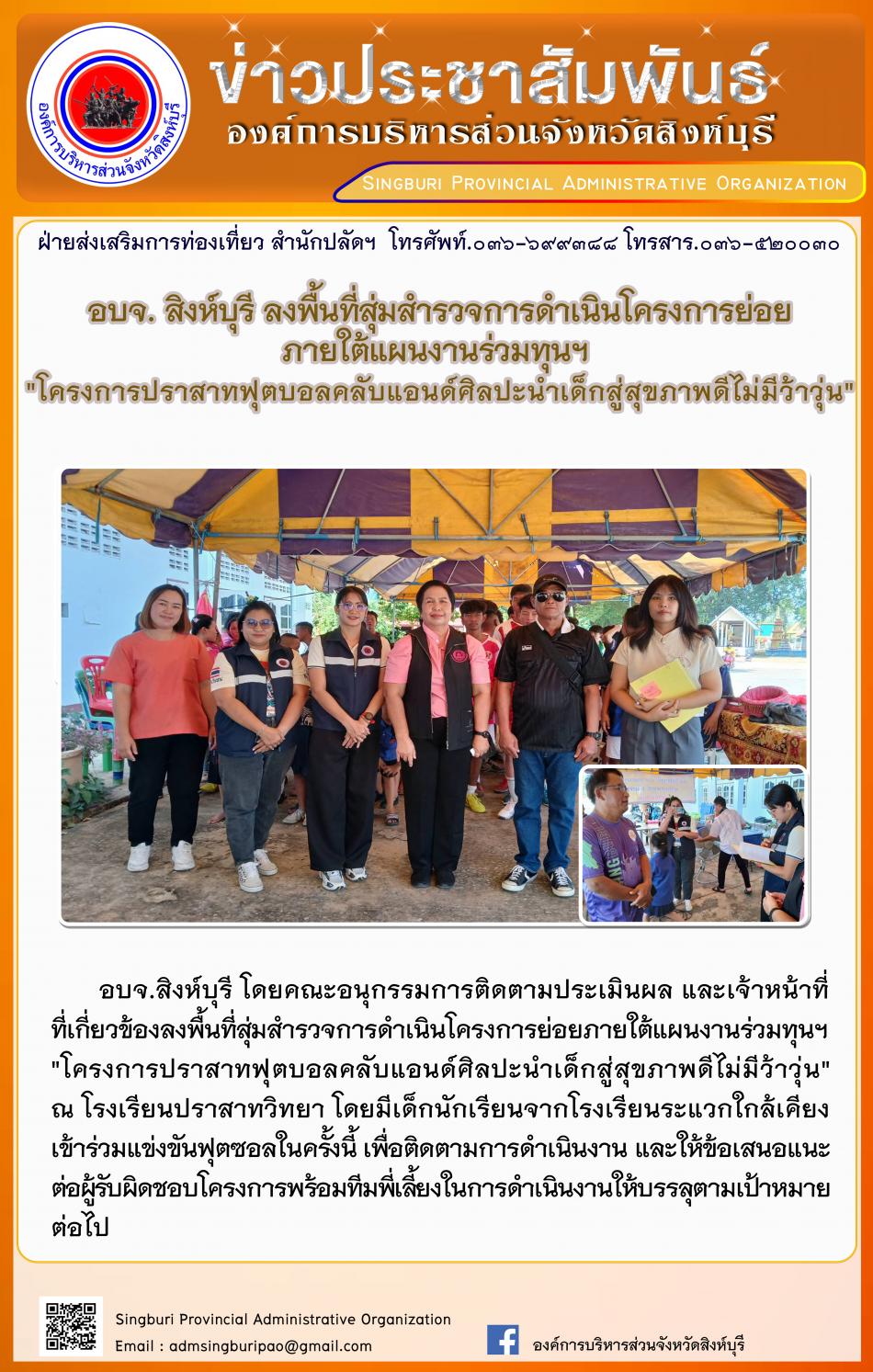 อบจ.สิงห์บุรี ลงพื้นที่สุ่มสำรวจการดำเนินโครงการย่อยภายใต้แผนงานร่วมทุนฯ"โครงการปราสาทฟุตบอลคลับแอนด์ศิลปะนำเด็กสู่สุขภาพดีไม่ว้าวุ่น" [14 พฤศจิกายน 2567]