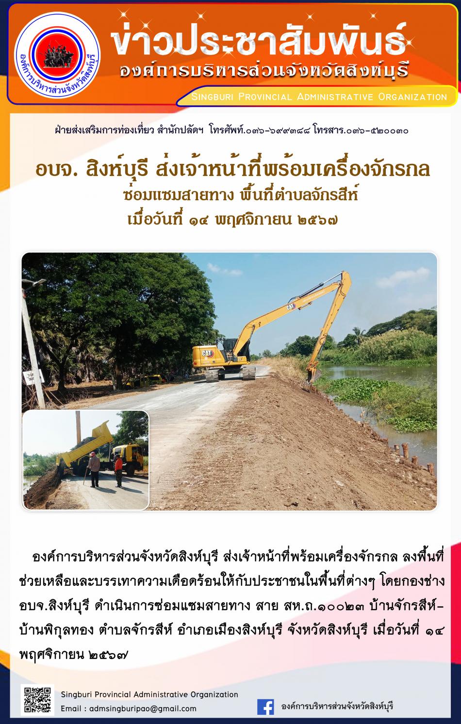 อบจ.สิงห์บุรี ส่งเจ้าหน้าที่พร้อมเครื่องจักรกล ซ่อมแซมสายทาง พื้นที่ตำบลจักรสีห์ [14 พฤศจิกายน 2567]