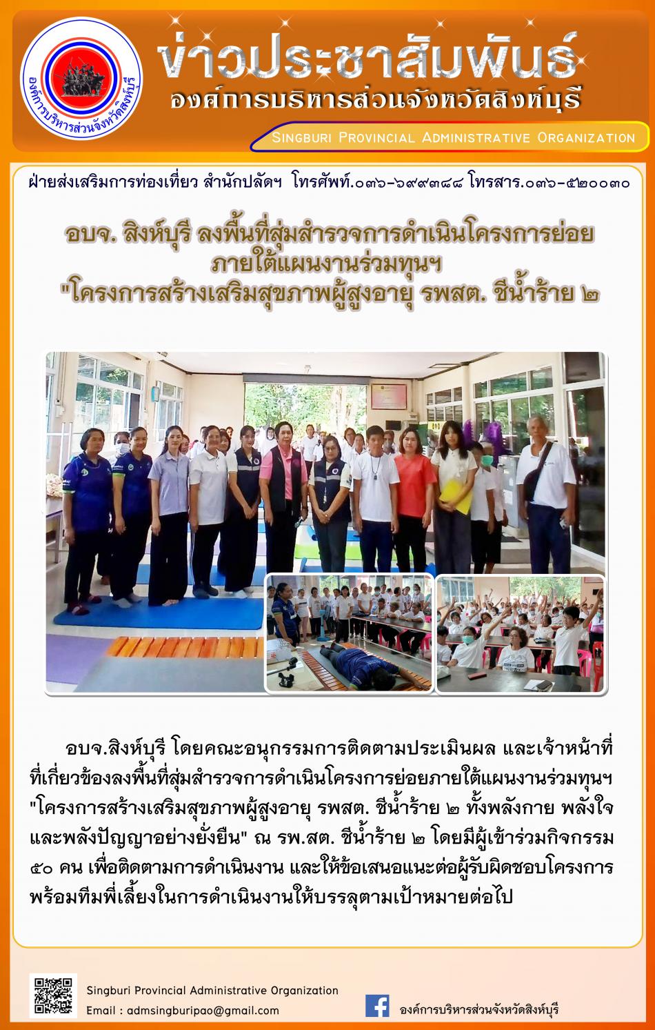 อบจ.สิงห์บุรี ลงพื้นที่สุ่มสำรวจการดำเนินโครงการย่อยภายใต้แผนงานร่วมทุนฯ"โครงการสร้างเสริมสุขภาพผู้สูงอายุ รพสต.ชีน้ำร้าย2" [14 พฤศจิกายน 2567]