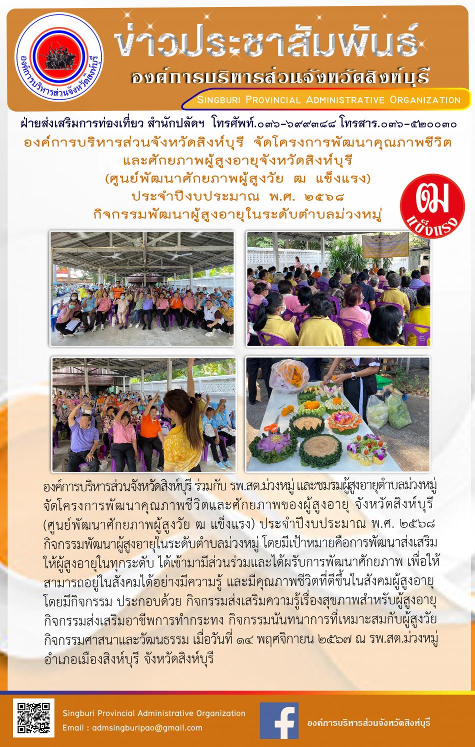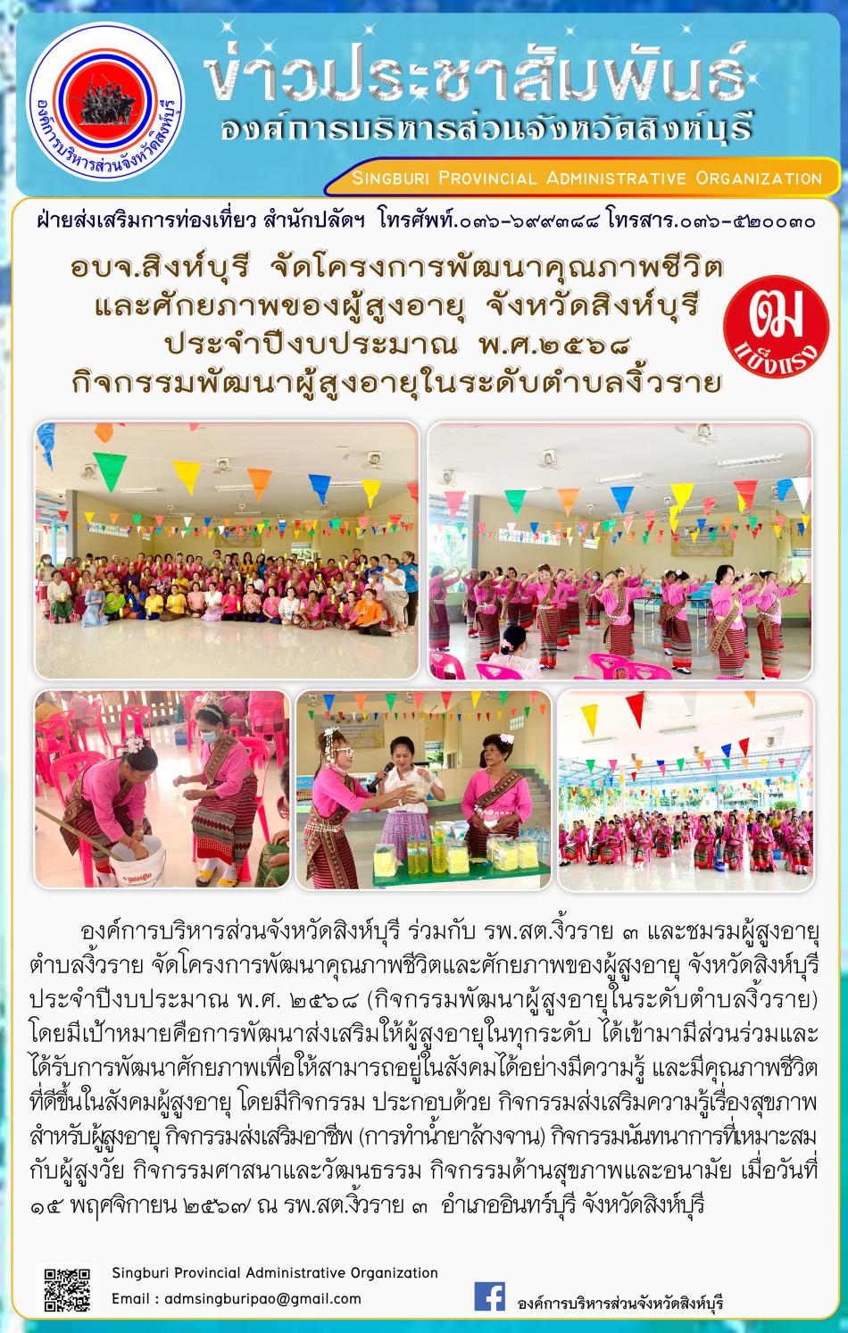 อบจ.สิงห์บุรี จัดโครงการพัฒนาคุณภาพชีวิตและศักยภาพผุ้สูงอายุจังหวัดสิงห์บุรี ประจำปีงบประมาณพ.ศ.2568 กิจกรรมพัฒนาผู้สูงอายุในระดับตำบลงิ้วราย [15 พฤศจิกายน 2567]