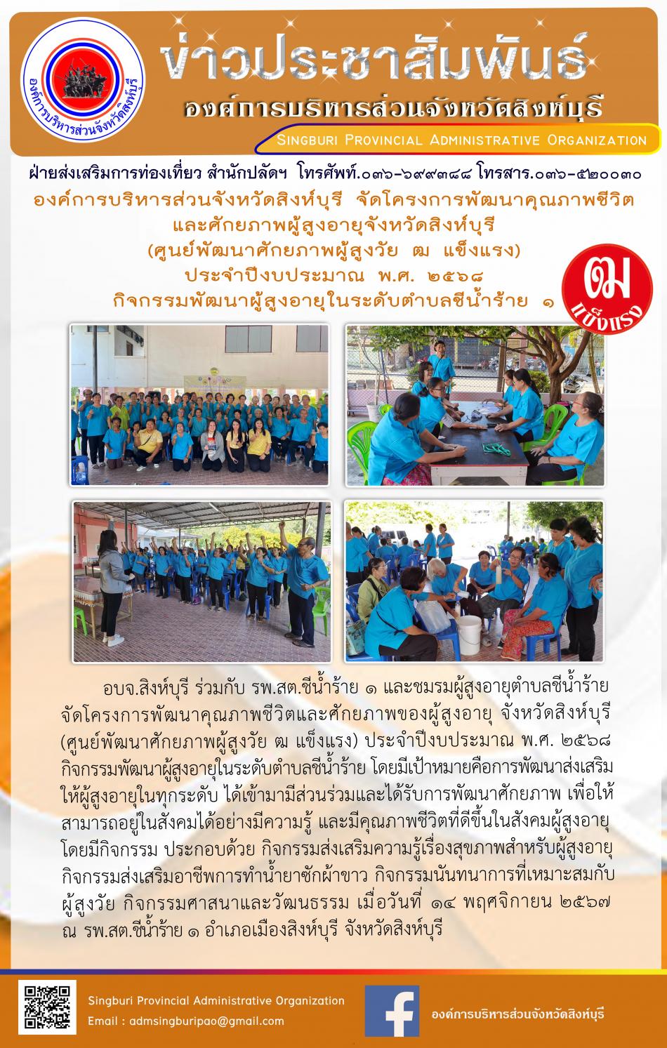 อบจ.สิงห์บุรี จัดโครงการพัฒนาคุณภาพชีวิตและศักยภาพผุ้สูงอายุจังหวัดสิงห์บุรี ประจำปีงบประมาณพ.ศ.2568 กิจกรรมพัฒนาผู้สูงอายุในระดับตำบลชีน้ำร้าย 1 [14 พฤศจิกายน 2567]
