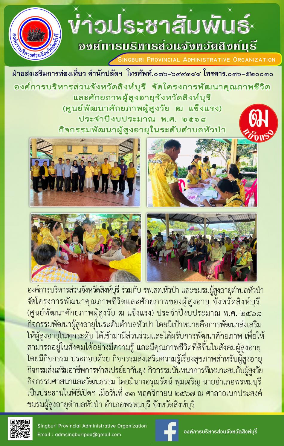 อบจ.สิงห์บุรี ร่วมกับ สสส. จัดโครงการสร้างเสริมสุขภาพผู้สูงอายุวัดสว่างณ์ทั้งพลังกาย พลังใจ และพลังปัญญาอย่างยั่งยืน [13 พฤศจิกายน 2567]