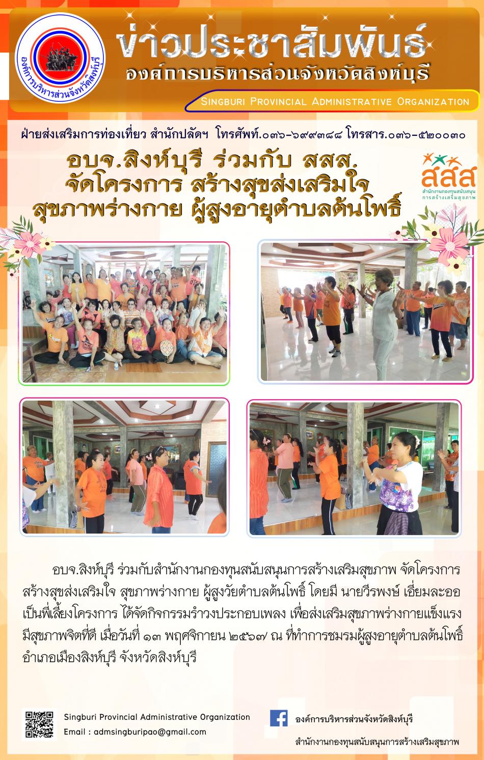 อบจ.สิงห์บุรี ร่วมกับ สสส. จัดโครงการสร้างเสริมสุขภาพผู้สูงอายุตำบลต้นโพธิ์ [13 พฤศจิกายน 2567]