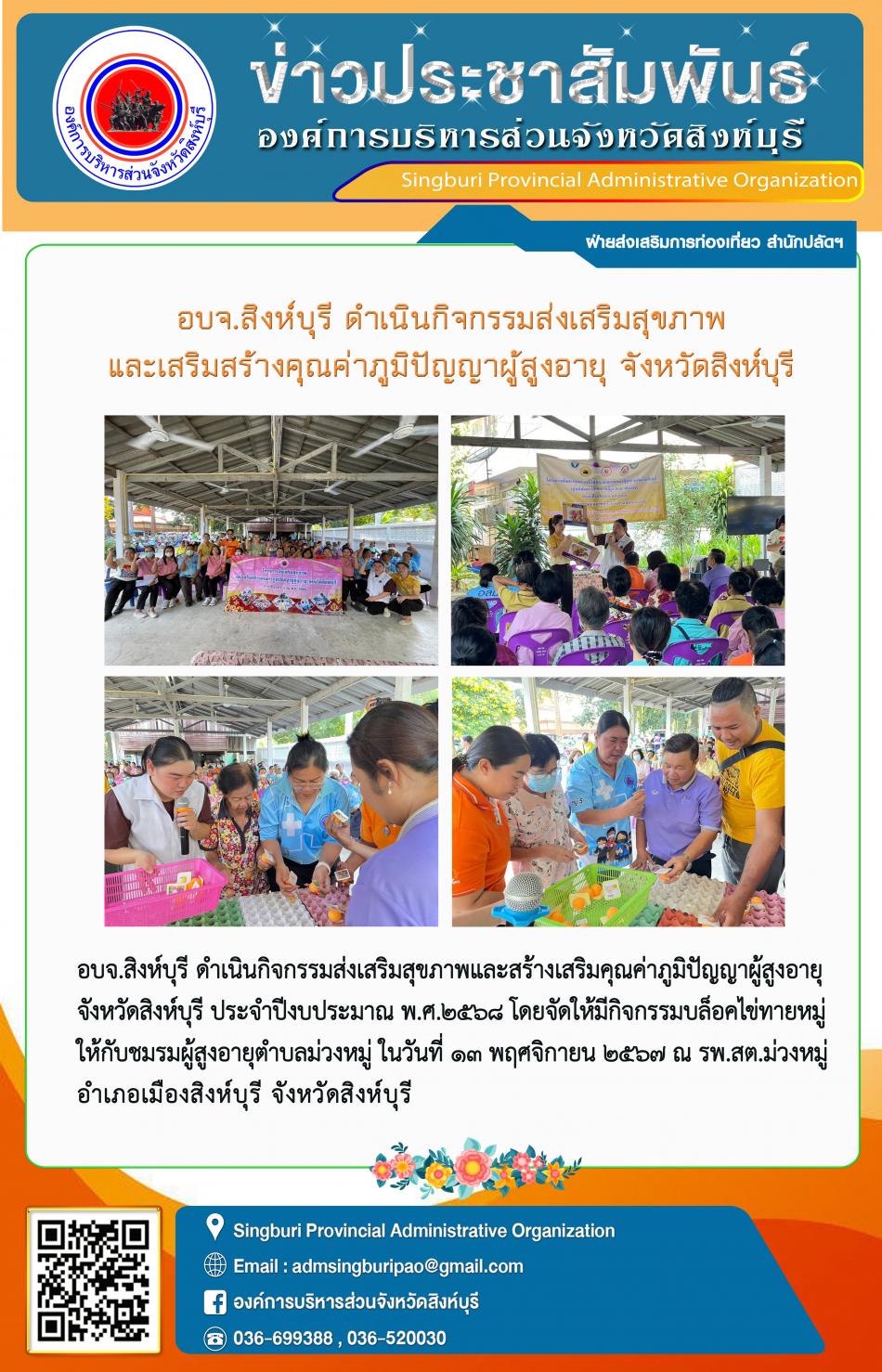 อบจ.สิงห์บุรี ดำเนินกิจกรรมส่งเสริมสุขภาพ สร้างจิตใจที่แจ่มใสให้กับผู้สุงอายุ จังหวัดสิงห์บุรี [13 พฤศจิกายน 2567]