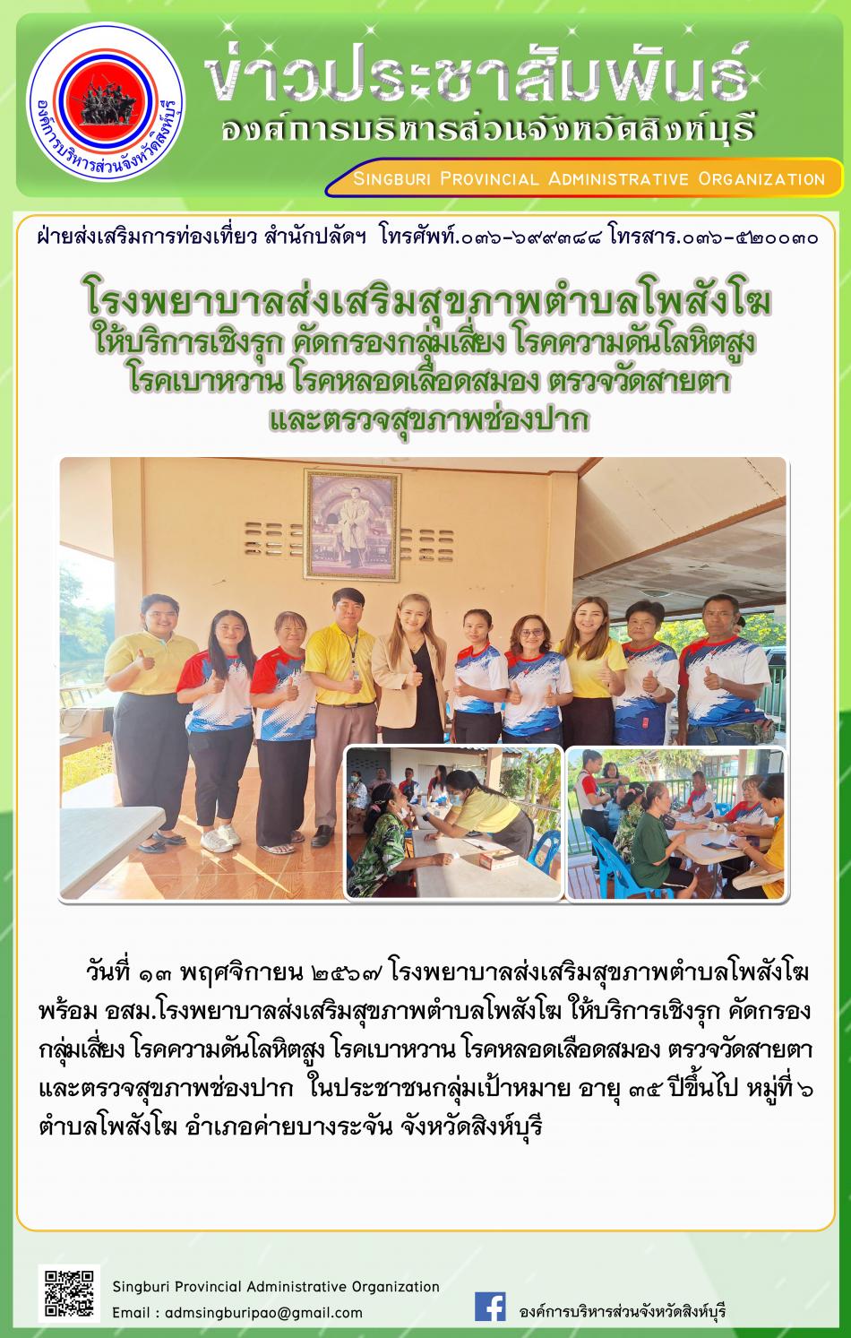 โรงพยาบาลส่งเวริมสุขภาพตำบลโพสังโฆ ให้บริการเชิงรุก คัดกรองกลุ่มเสี่ยง โรคความดันโลหิตสูง โรคเบาหวาน โรคหลอดเลือดสมอง ตรวจวัดสายตา และตรวจสุขภาพช่องปาก [13 พฤศจิกายน 2567]