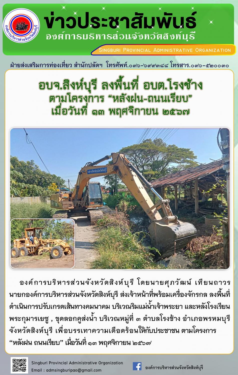 อบจ.สิงห์บุรี ลงพื้นที่ อบต.โรงช้าง ตามโครงการ "หลังฝน - ถนนเรียบ" [13 พฤศจิกายน 2567]