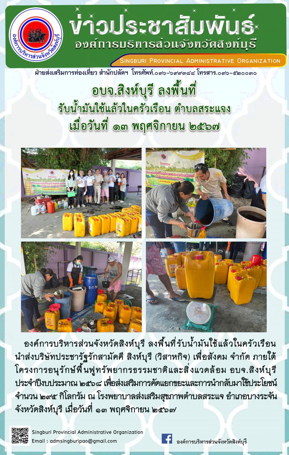 อบจ.สิงห์บุรี ลงพื้นที่รับน้ำมันใช้แล้วในครัวเรือน ตำบลสระแจง [13 พฤศจิกายน 2567]