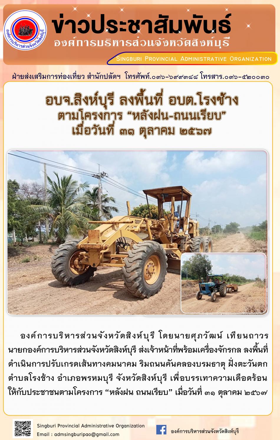 อบจ.สิงห์บุรี ลงพื้นที่ อบต.โรงช้าง ตามโครงการ "หลังฝน - ถนนเรียบ" [31 ตุลาคม 2567]