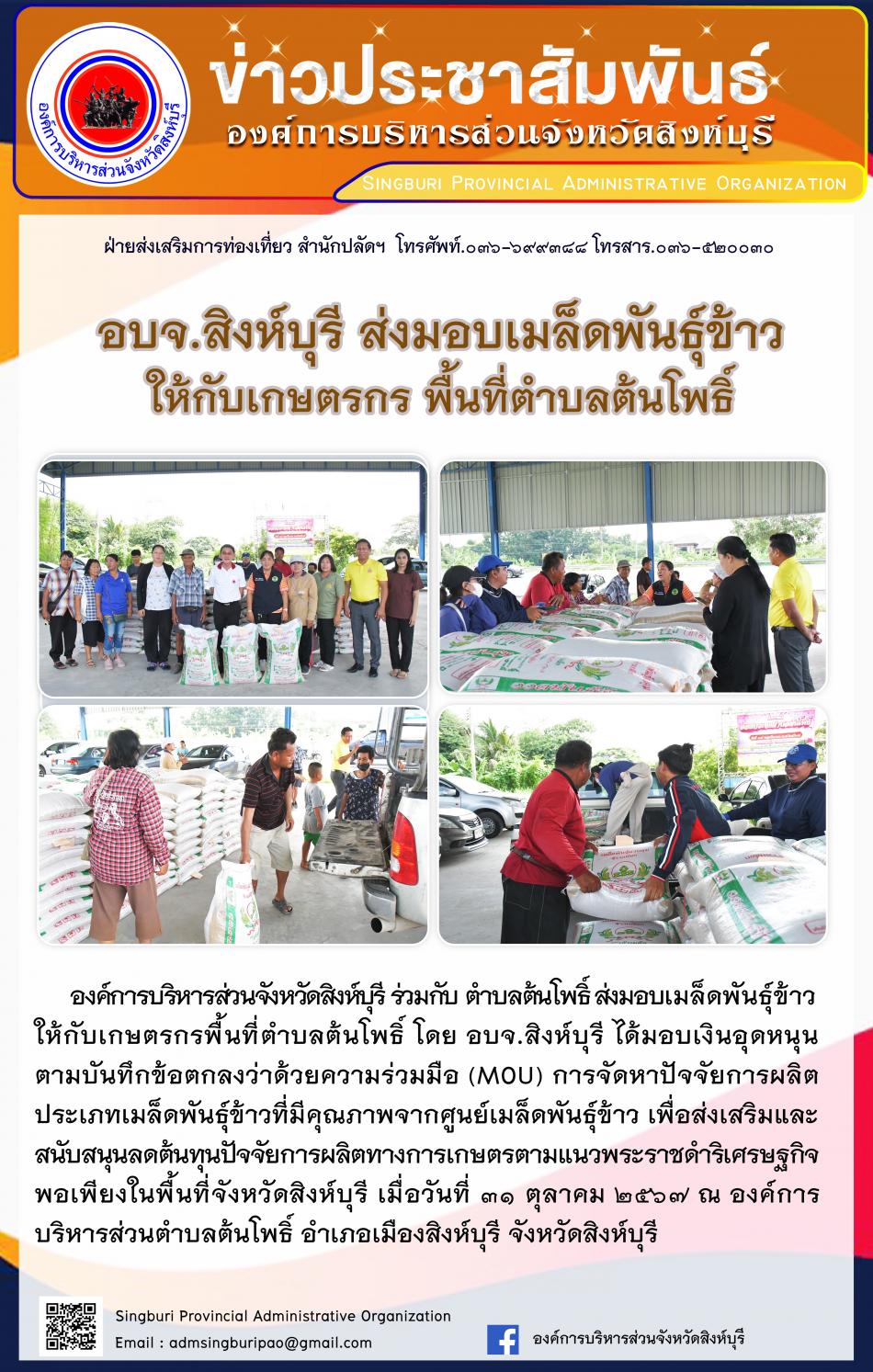 อบจ.สิงห์บุรี ส่งมอบเมล็ดพันธ์ข้าวให้กับเกษตรกร พื้นที่ตำบลต้นโพธิ์ [31 ตุลาคม 2567]