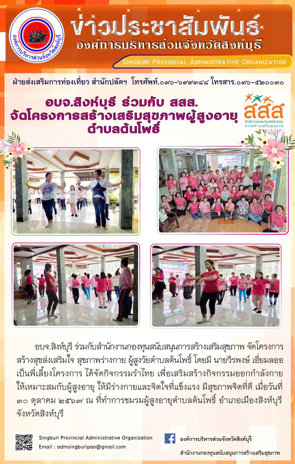 อบจ.สิงห์บุรี ร่วมกับ สสส. จัดโครงการสร้างเสริมสุขภาพผู้สูงอายุตำบลต้นโพธิ์ [30 ตุลาคม 2567]