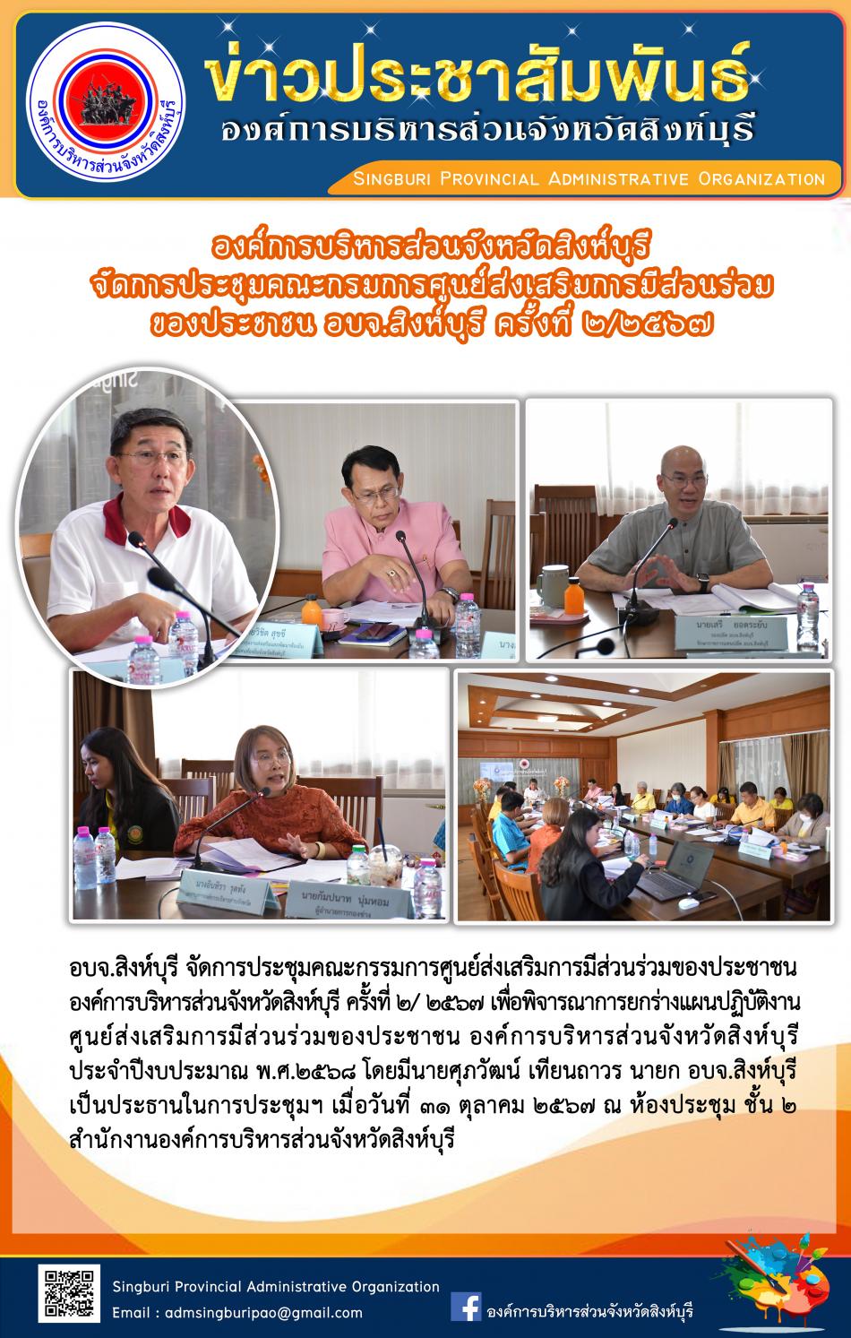 องค์การบริหารส่วนจังหวัดสิงห์บุรี จัดการประชุมคณะกรรมการศูนย์ส่งเสริมการมีส่วนร่วมของประชาชน อบจ.สิงหืบุรี ครั้งที่ 2/2567 [31 ตุลาคม 2567]