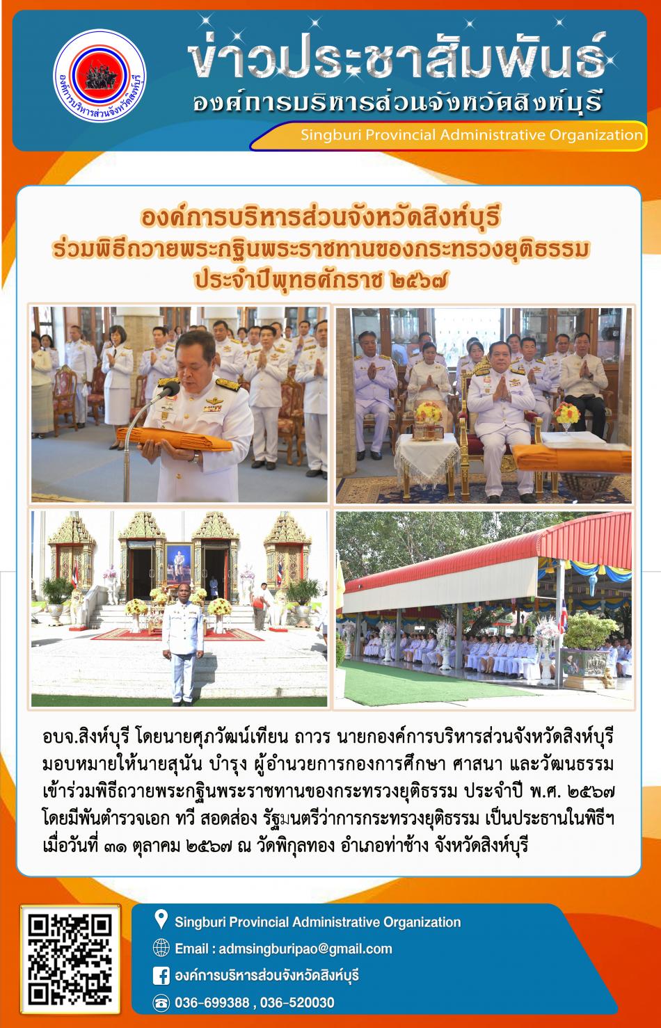 องค์การบริหารส่วนจังหวัดสิงห์บุรี ร่วมพิธีถวายพระกฐินพระราชทานของกระทรวงยุติธรรม ประจำปีพุทธศักราช 2567 [31 ตุลาคม 2567]