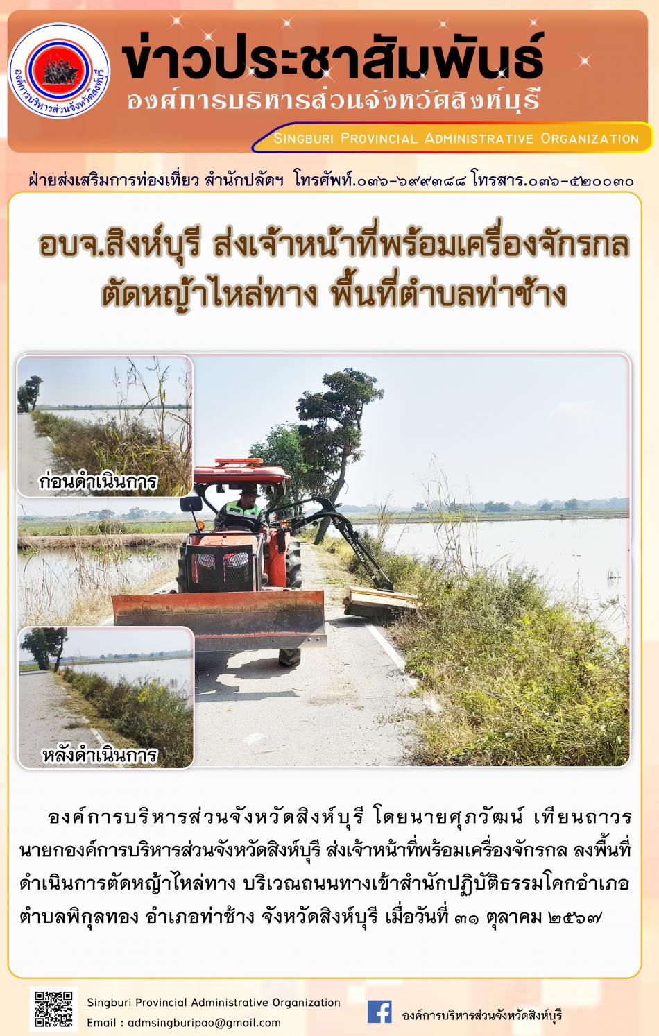 อบจ.สิงห์บุรี ส่งเจ้าหน้าที่พร้อมเครื่องจักรกล ตัดหญ้าไหล่ทาง พื้นที่ตำบลท่าช้าง [31 ตุลาคม 2567]
