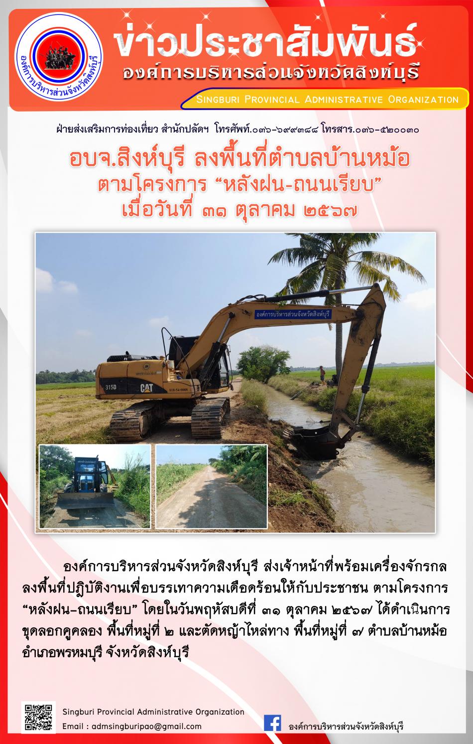 อบจ.สิงห์บุรี ลงพื้นที่ ตำบลบ้านหม้อ ตามโครงการ "หลังฝน - ถนนเรียบ" [31 ตุลาคม 2567]