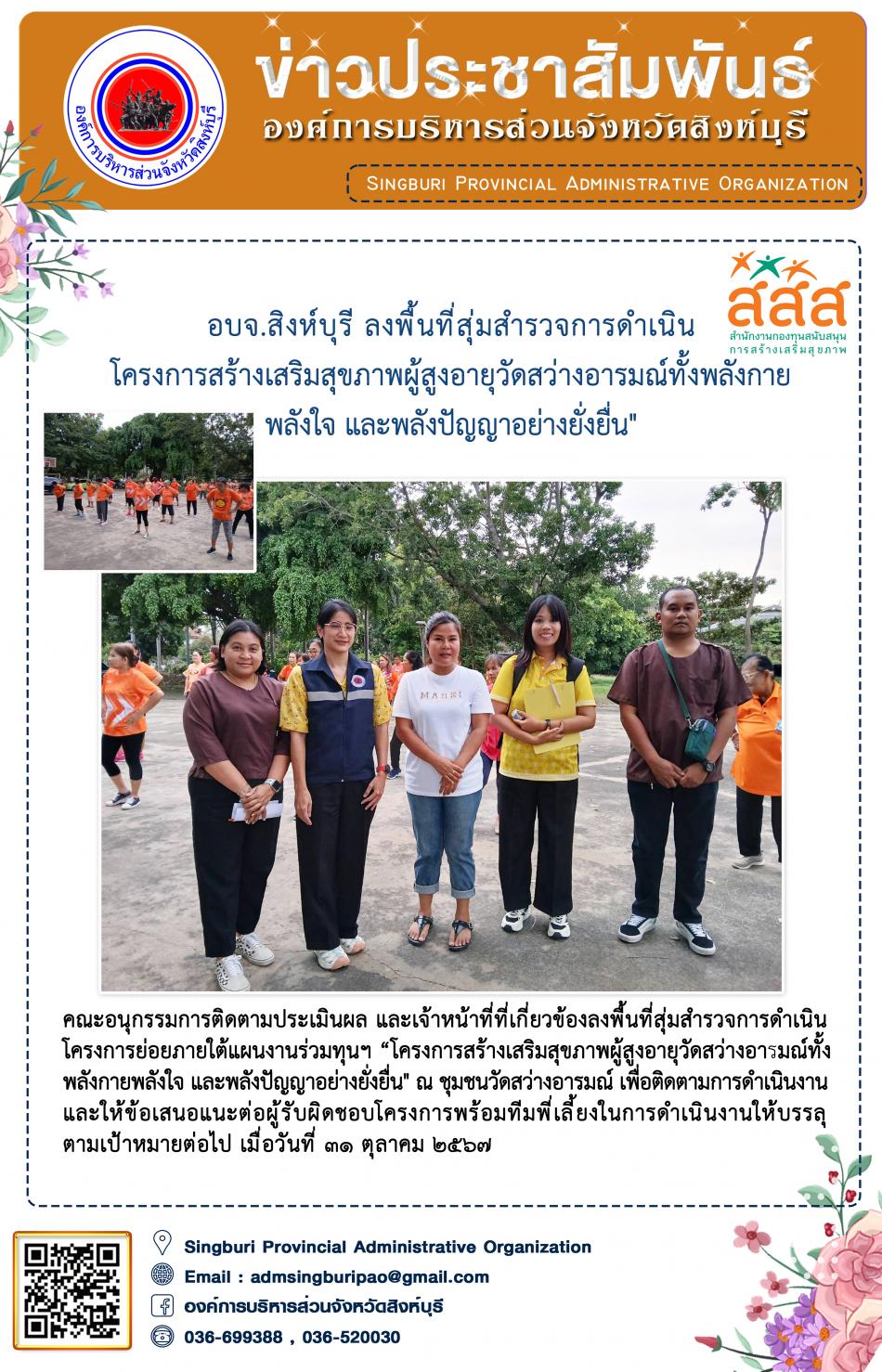 อบจ.สิงห์บุรี ลงพื้นที่สุ่มสำรวจการดำเนินโครงการสร้างเสริมสุขผู้สูงอายุวัดสว่างอารมณ์ ทั้งพลังกาย พลังใจ และปัญญาอย่างยั่งยื่น [31 ตุลาคม 2567]