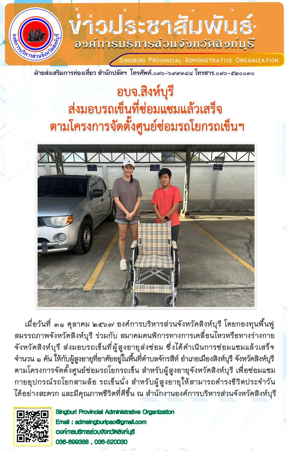 อบจ.สิงห์บุรี ส่งมอบรถเข็นที่ซ่อมแซมแล้วเสร็จตามโครงการจัดตั้งศูนย์ซ่อมรถโยกรถเข็นฯ [31 ตุลาคม 2567]