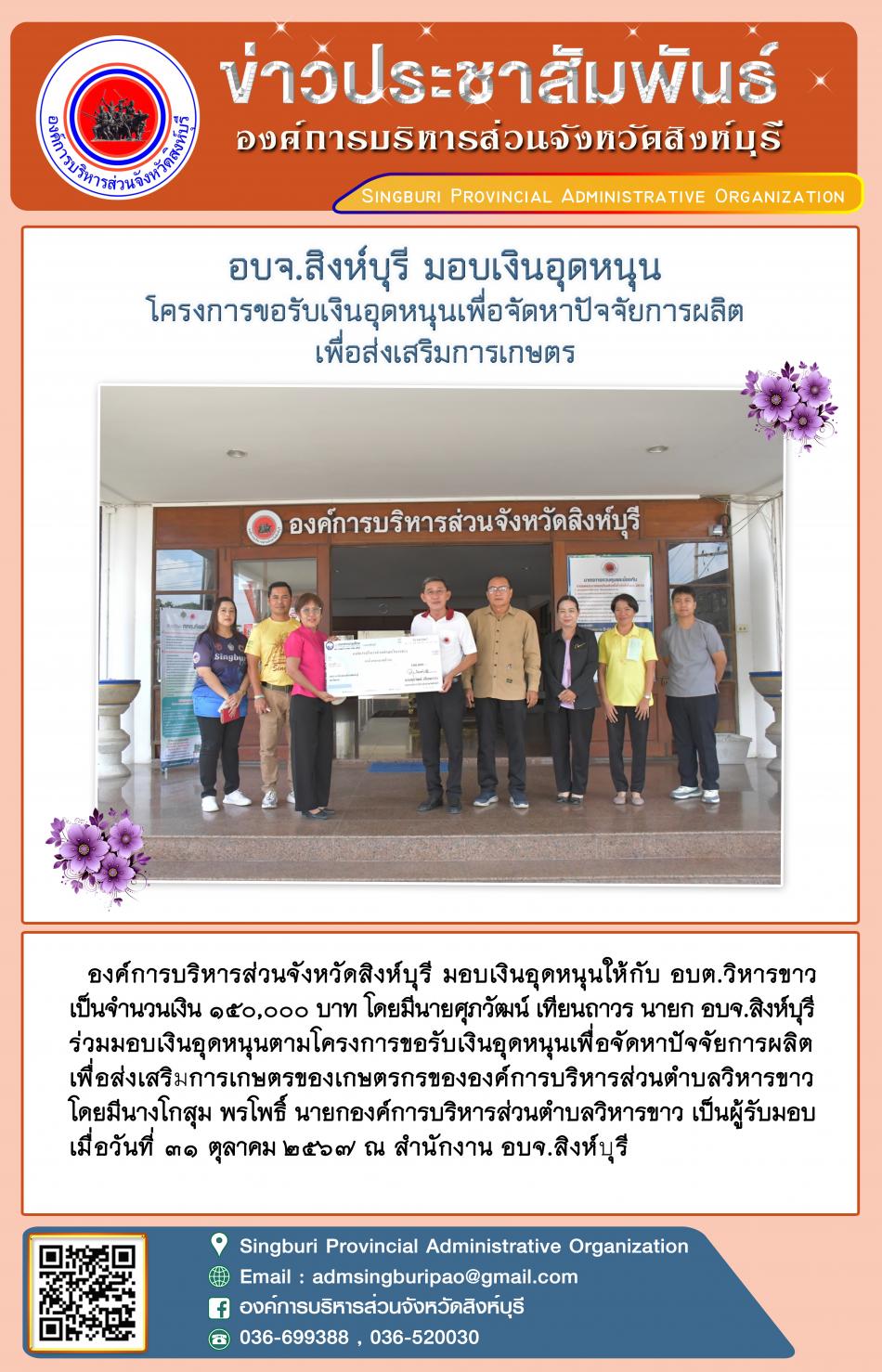 อบจ.สิงห์บุรี มอบเงินอุดหนุนโครงการขอรับเงินอุดหนุนเพื่อจัดหาปัจจัยการผลิตเพื่อส่งเสริมการเกษตร [31 ตุลาคม 2567]