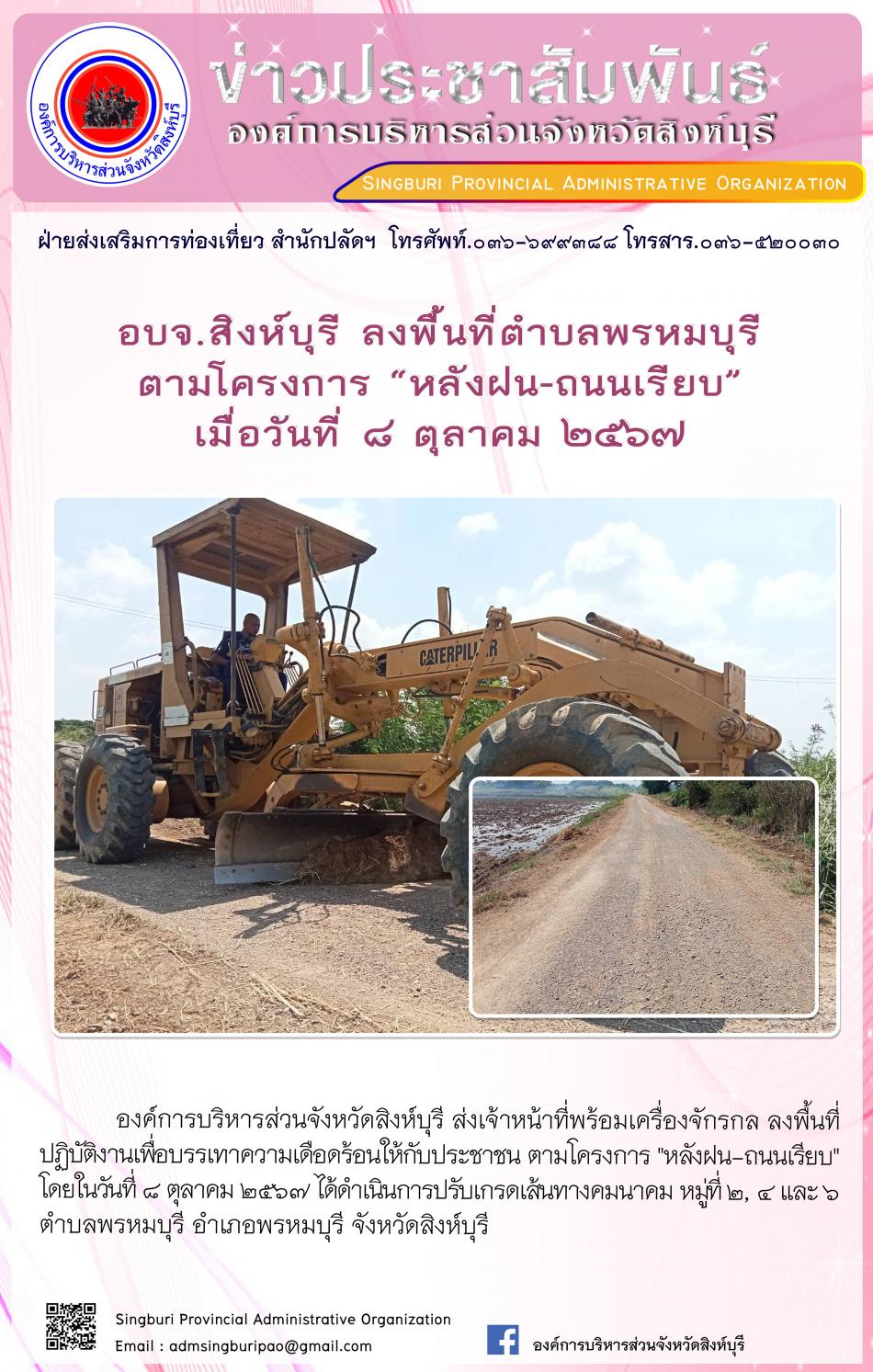 อบจ.สิงห์บุรี ลงพื้นที่ ตำบลพรหมบุรี ตามโครงการ "หลังฝน - ถนนเรียบ" [8 ตุลาคม 2567]