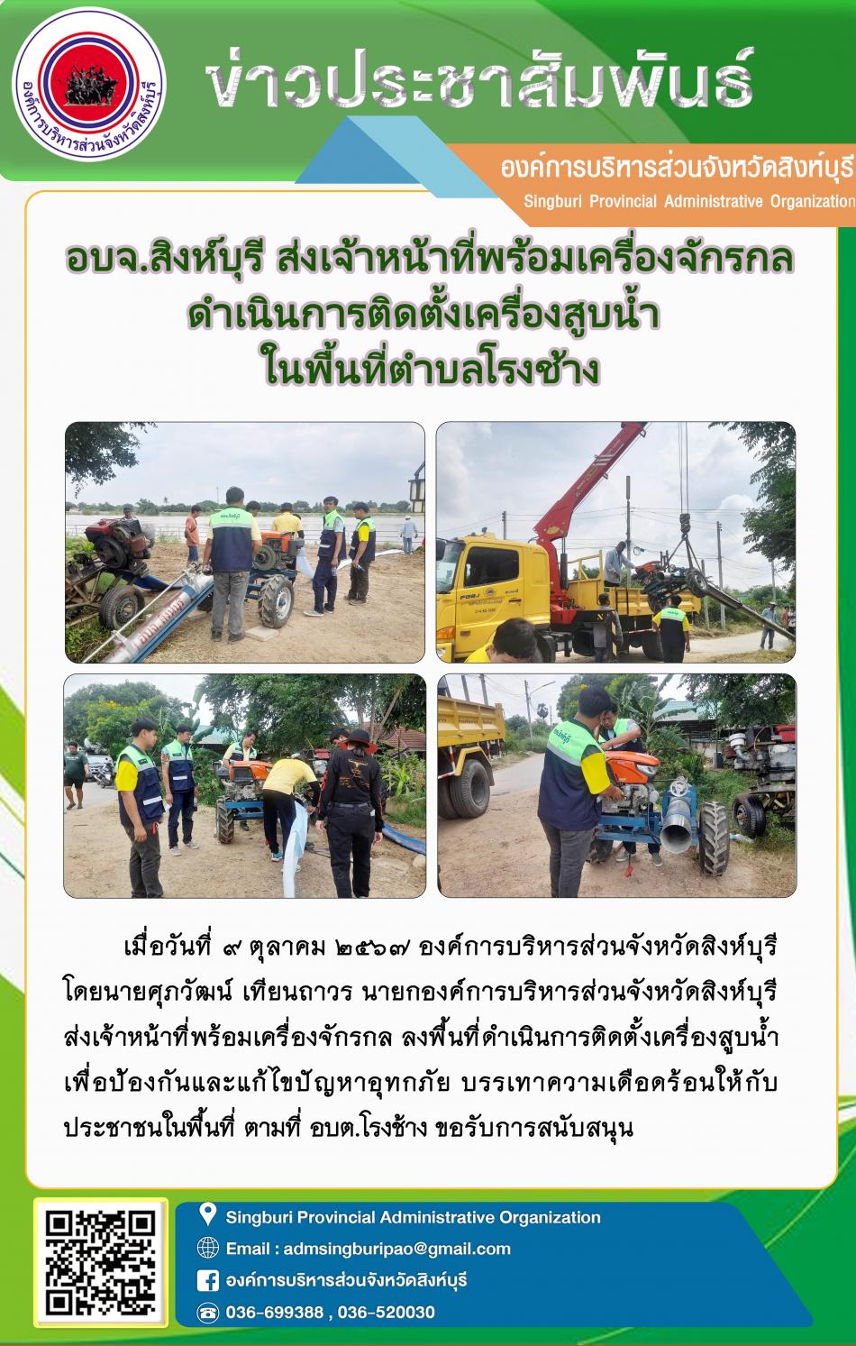 อบจ.สิงห์บุรี ส่งเจ้าหน้าที่พร้อมเครื่องจักรกล ดำเนินการติดตั้งเครื่องสูบน้ำ ในพื้นที่ตำบลโรงช้าง [9 ตุลาคม 2567]