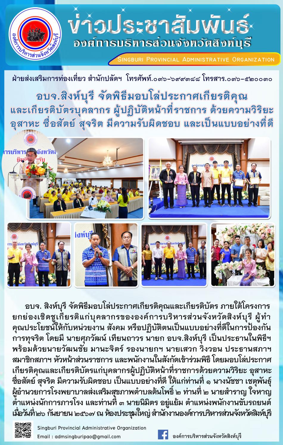 องค์การบริหารส่วนจังหวัดสิงห์บุรี จัดพิธีมอบโล่ประกาศเกียรติคุณให้กับผู้ทำคุณประโยชน์ต่อการพัฒนาบุคคลากรขององค์การบริหารส่วนจังหวัดสิงห์บุรี [27 กันยายน 2567]