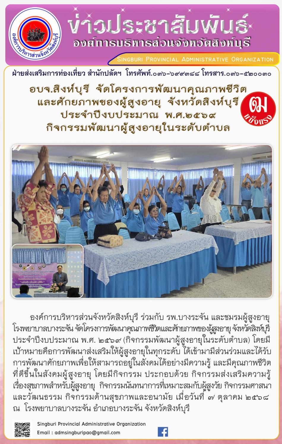 อบจ.สิงห์บุรี จัดโครงการพัฒนาคุณภาพชีวิตและศักยภาพของผู้สูงอายุ จังหวัดสิงห์บุรี ประจำปีงบประมาณ พ.ศ. 2569 กิจกรรมพัฒนาผู้สูงอายุระดับตำบล [7 ตุลาคม 2568]