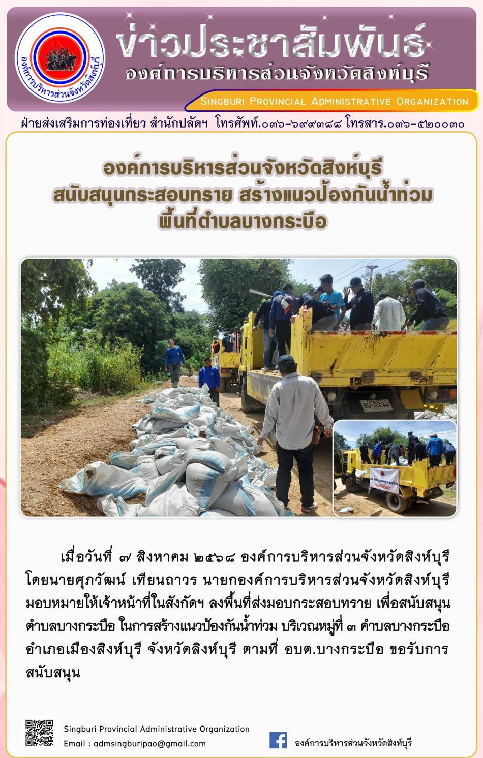 องค์การบริหารส่วนวังหวัดสิงห์บุรี สนับสนุนกระสอบทราย สร้างแนวป้องกันนั้งท่วม พื้นที่ตำบลบางกระบือ [7 ตุลาคม 2568]