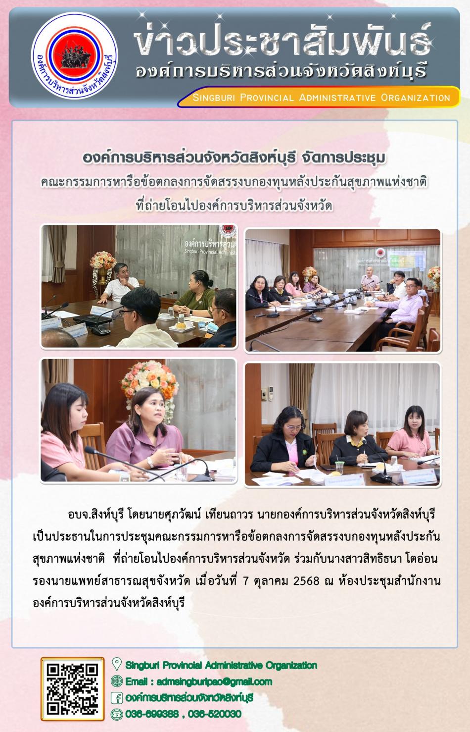 องค์การบริหารส่วนจังหวัดสิงห์บุรี จัดการประชุมคณะกรรมการหารือข้อตกลงจัดสรรงบกองทุนหลังประกันสุขภาพแห่งชาติที่ถ่ายโอนไปองค์การบริหารสวนจังหวัด [7 ตุลาคม 2568]