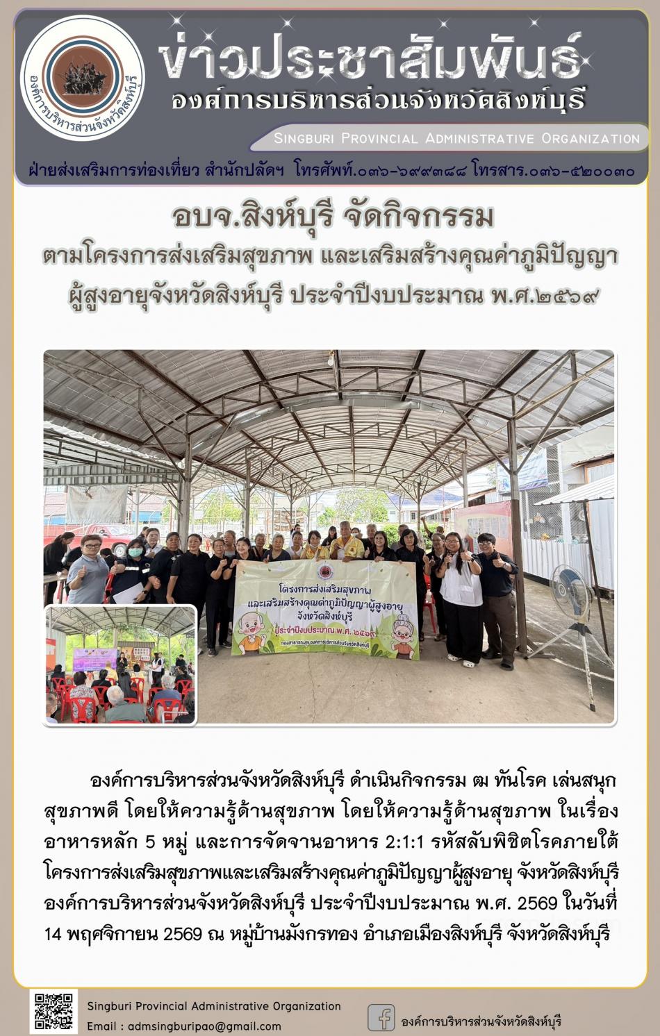 อบจ.สิงห์บุรี จัดกิจกรรม ตามโครงการส่งเสริมสุขภาพ และเสริมสร้างคุณค่าภูมิปัญญาผู้สูงอายุจังหวัดสิงห์บุรี ประจำปีงบประมาณพ.ศ. 2569 [14 พฤศจิกายน 2568]