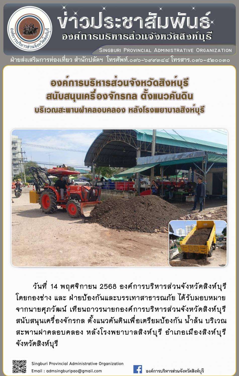 องค์การบริหารส่วนจังหวัดสิงห์บุรี สนับสนุนเครื่องจักรกล ตั้งแนวคันดิน บริเวณสะพานฝาคลอบคลอง หลังโรงพยาบาลสิงห์บุรี [14 พฤศจิกายน 2568]