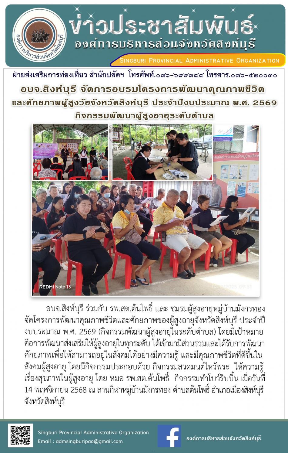 อบจ.สิงห์บุรี การอบรมโครงการพัฒนาคุณภาพชีวิตและศักยภาพ ผู้สูงวัยจังหวัดสิงห์บุรี ประจำปีงบประมาณพ.ศ. 2569 กิจกรรมพัฒนาผู้สูงอายุระดับตำบล [14 พฤศจิกายน 2568]