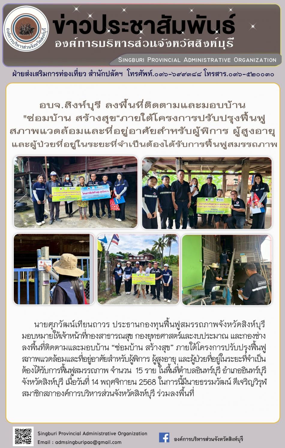 อบจ.สิงห์บุรี ลงพื้นที่ติดตามและมอบบ้าน "ซ่อมบ้าน สร้างสุข" ภายใต้โครงการปรับปรุงฟื้นฟูสภาพแวดล้อมและที่อยู่อาศัยสำหรับผู้พิการผู้สูงอายุ... [14 พฤศจิกายน 2568]