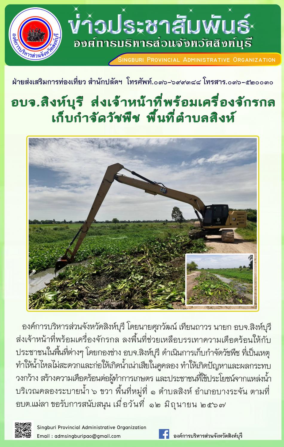 อบจ.สิงห์บุรี ส่งเจ้าหน้าที่พร้อมเครื่องจักรกล เก็บกำจัดวัชพืช พื้นที่ตำบลสิงห์ [12 มิถุนายน 2567]