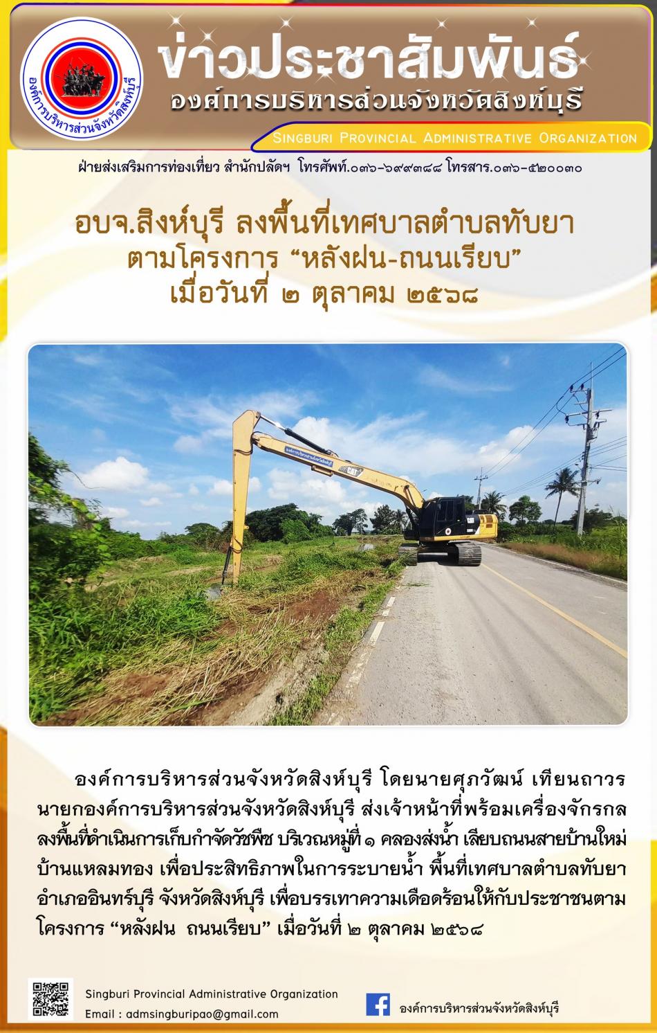 อบจ.สิงห์บุรี ลงพื้นที่ ตำบลทับยา ตามโครงการ “ หลัง ฝน- ถนนเรียบ” [2 ตุลาคม 2568]