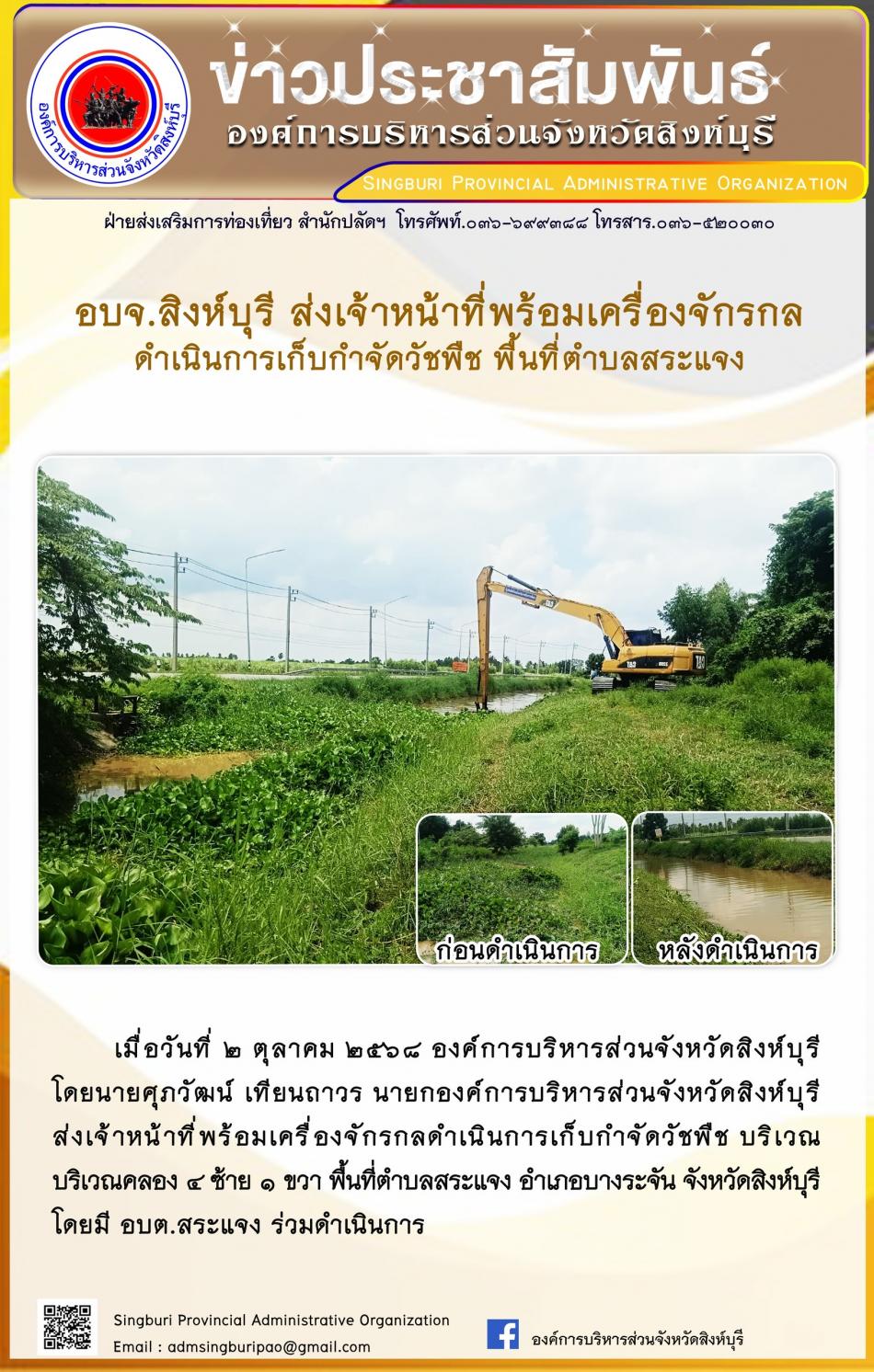 อบจ. สิงห์บุรี ส่งเจ้าหน้าที่นร้อมเครื่องจักรกล ดำเนินการเก็บกำจัดวัชพืช พื้นที่ตำบลสระแจง [2 ตุลาคม 2568]