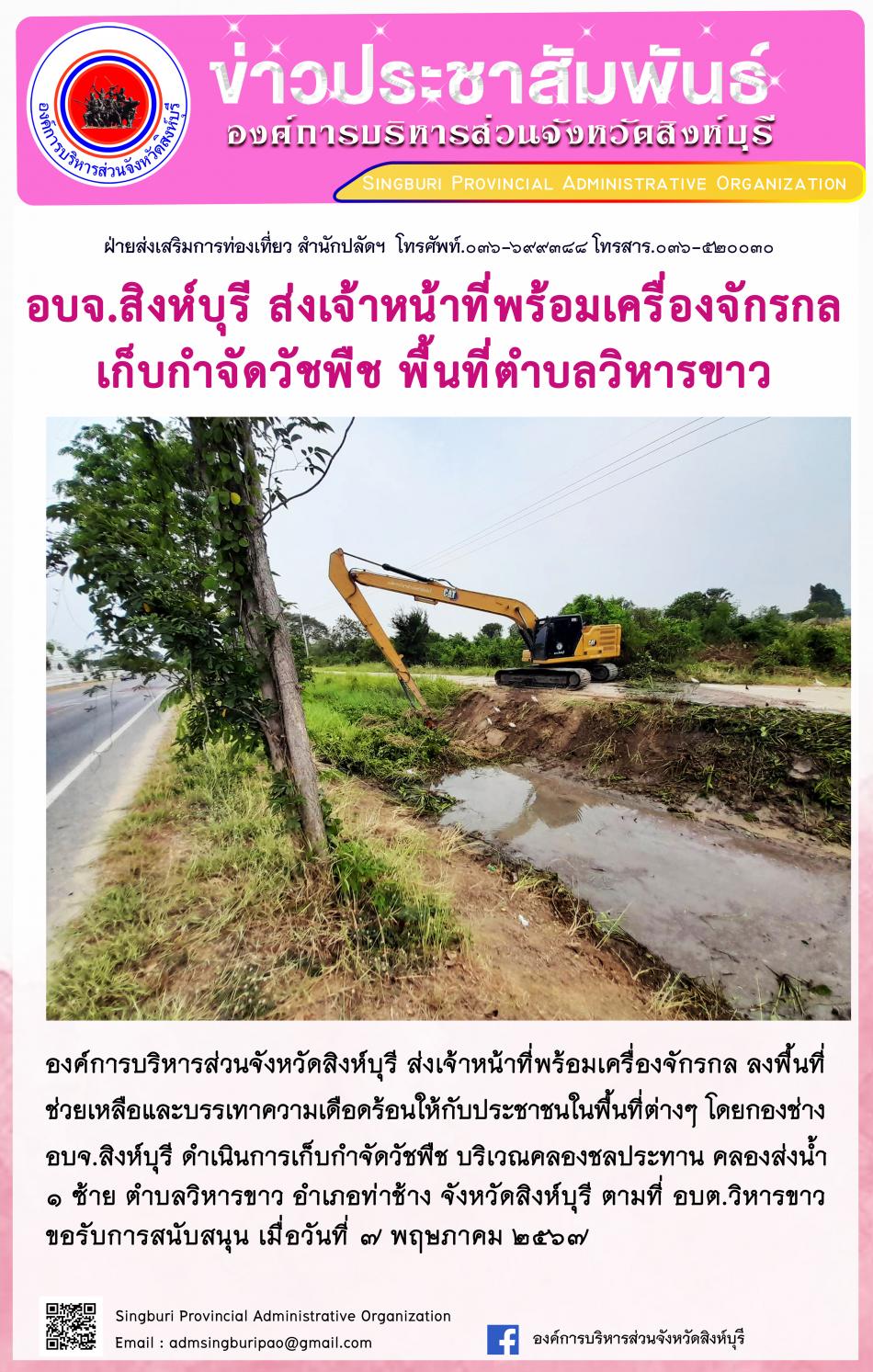 อบจ.สิงห์บุรี ส่งเจ้าหน้าที่พร้อมเครื่องจักรกล เก็บกำจัดวัชพืช พื้นที่ตำบลวิหารขาว [7 พฤษภาคม 2567]