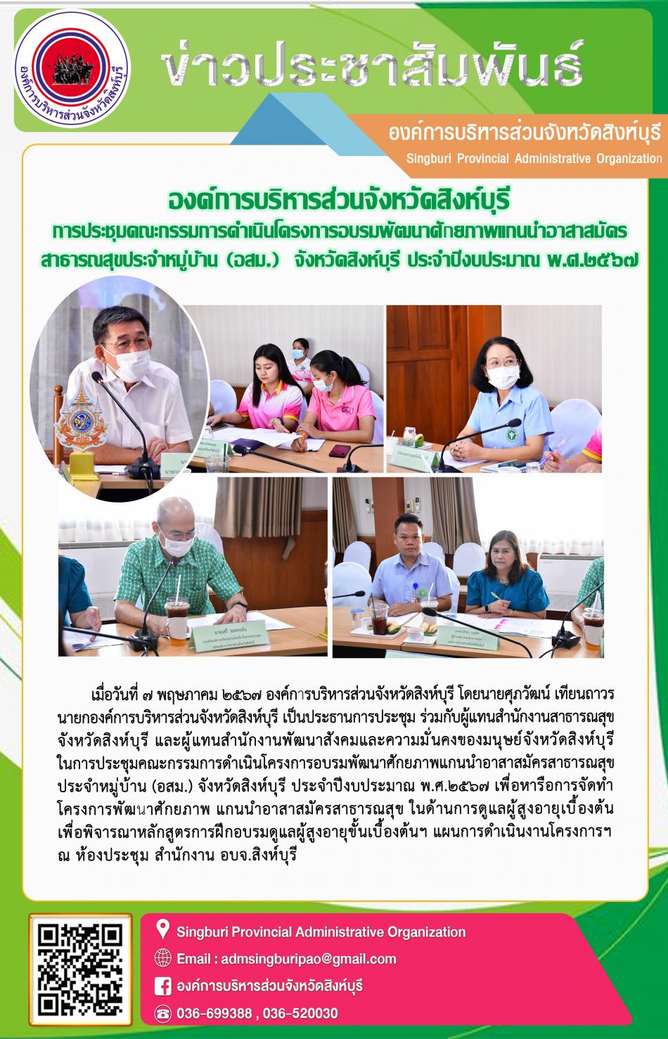 องค์การบริหารส่วนจังหวัดสิงห์บุรี ร่วมประชุมคณะกรรมการดำเนินโครงการอบรมพัฒนาศักยภาพแกนนำอาสาสมัครสาธารณสุขประจำหมู่บ้าน(อสม.) จังหวัดสิงห์บุรี ประจำปีงบประมาณ พ.ศ.2567 [7 พฤษภาคม 2567]